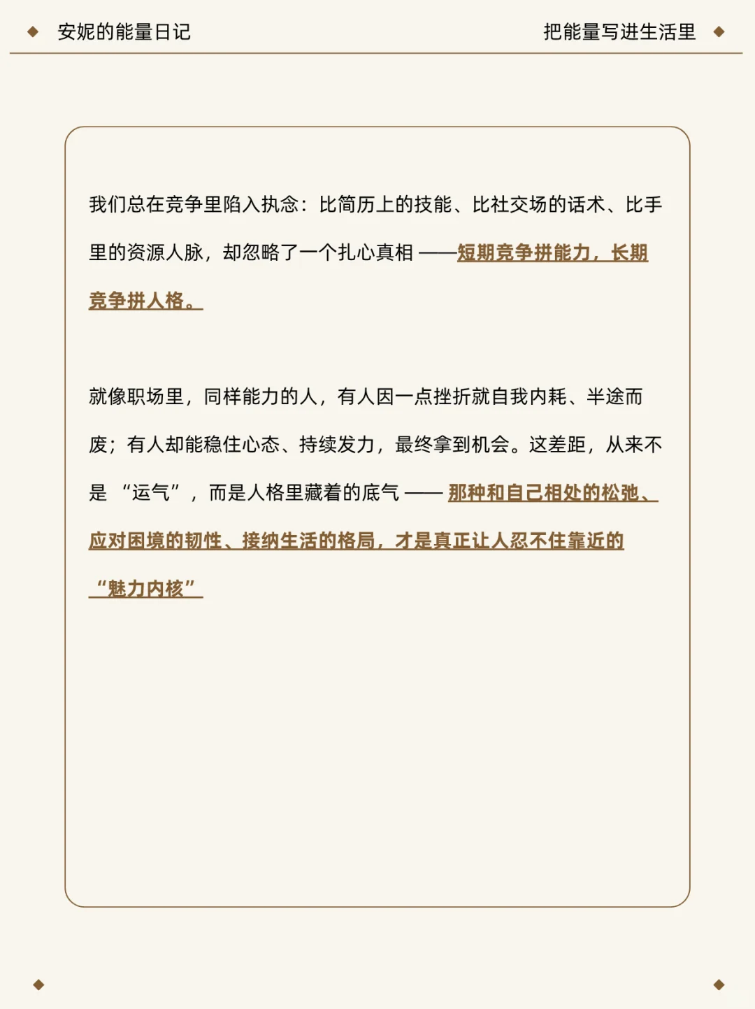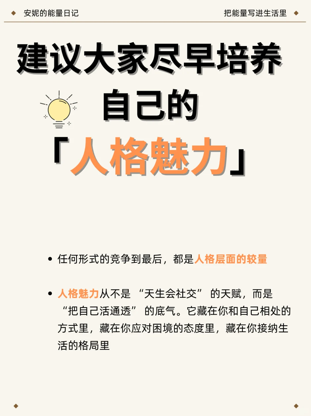 总纠结能力、技巧、资源?但长期竞争,拼的是人格魅力!它不是天生社交天赋,是把自己活通透的底气——藏在你和自己相处的方式、应对困境的态度、接纳生活的格局里。