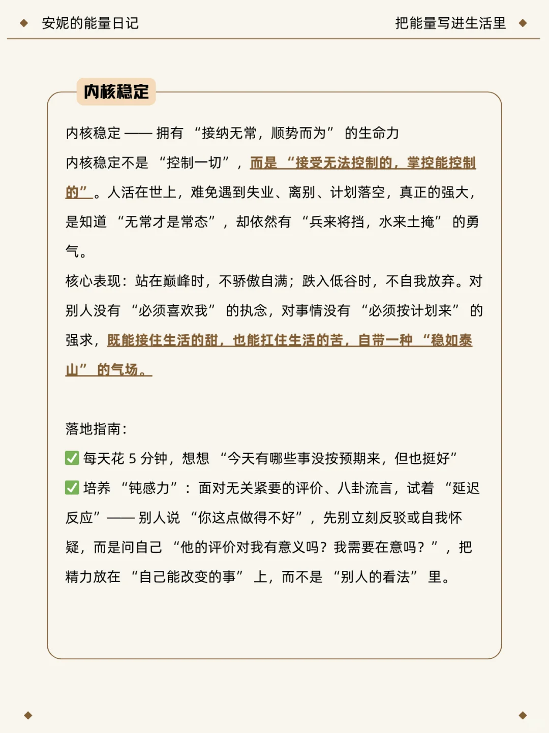 内核稳定不是控制一切,是接受无法控制的,掌控能控制的。核心表现:巅峰时不骄傲,低谷时不放弃,对人对事无执念,自带“稳如泰山”的气场。