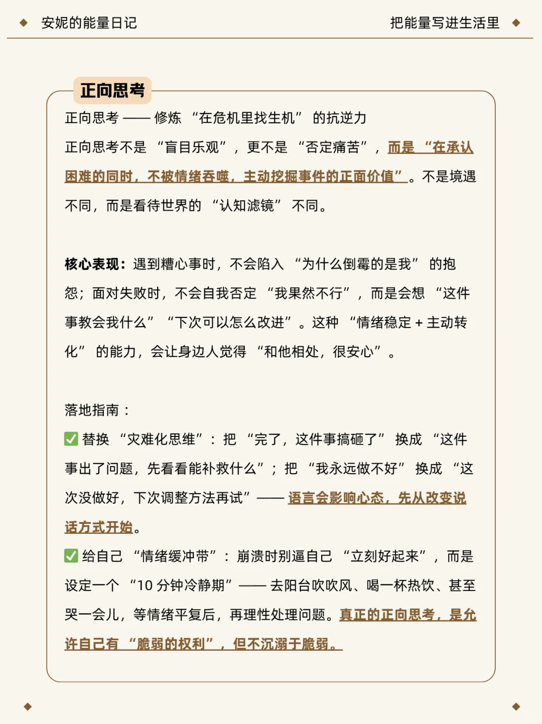 正向思考不是盲目乐观,是承认困难时不被情绪吞噬,主动挖掘事件正面价值。核心表现:遇糟心事不抱怨“为什么是我”,面对失败想“教会我什么”,让身边人觉得“和他相处很安心”。