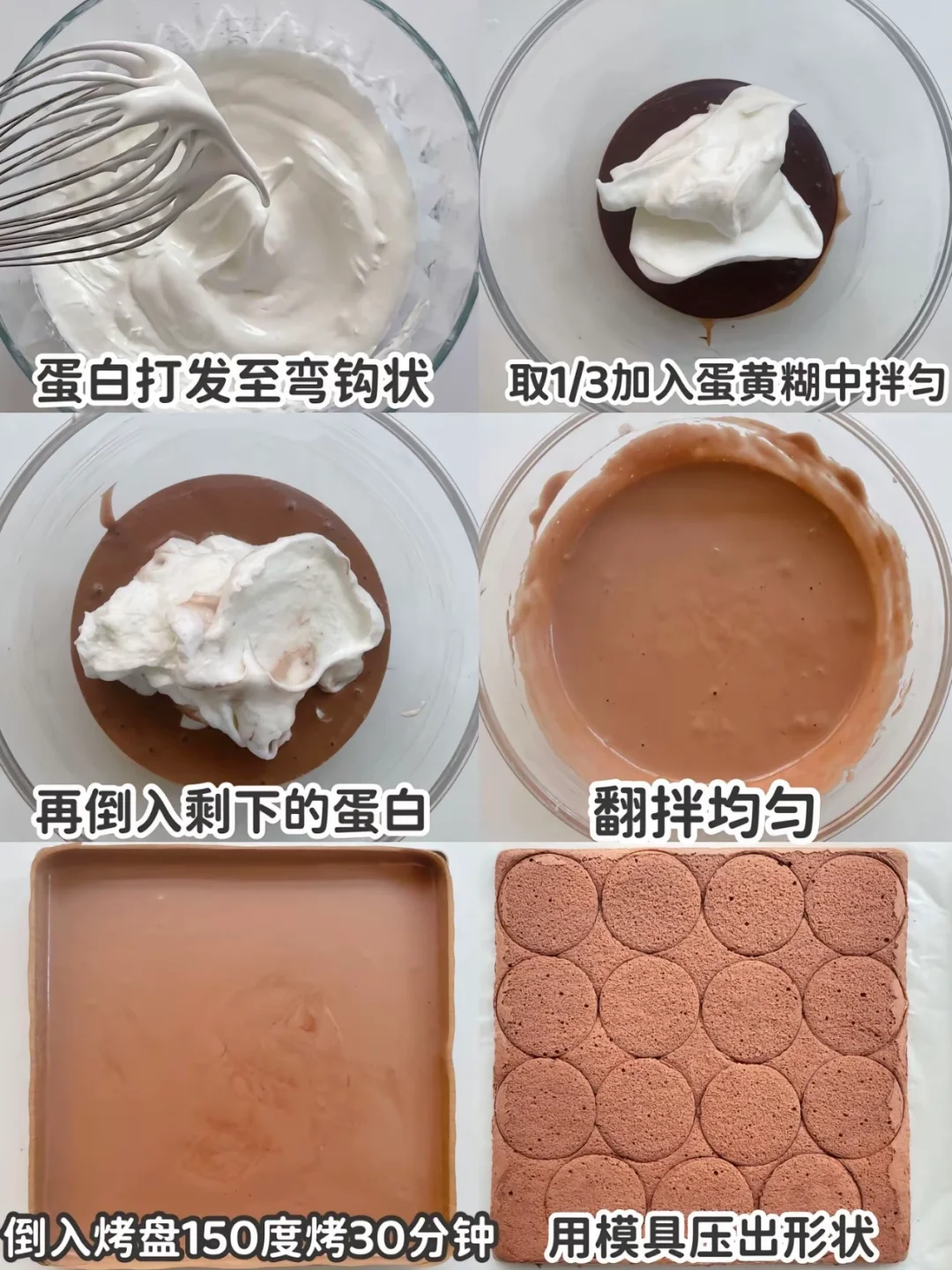 3⃣️倒入烤盘预热好的烤箱150度烤30分钟。晾凉后用模具压出蛋糕片;