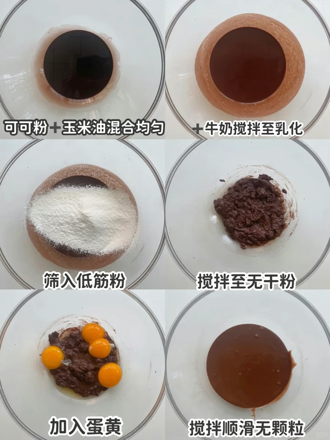1⃣️可可粉➕玉米油搅匀,加牛奶搅拌至乳化,筛入低筋粉混合没有干粉,加蛋黄搅拌顺滑无颗粒;