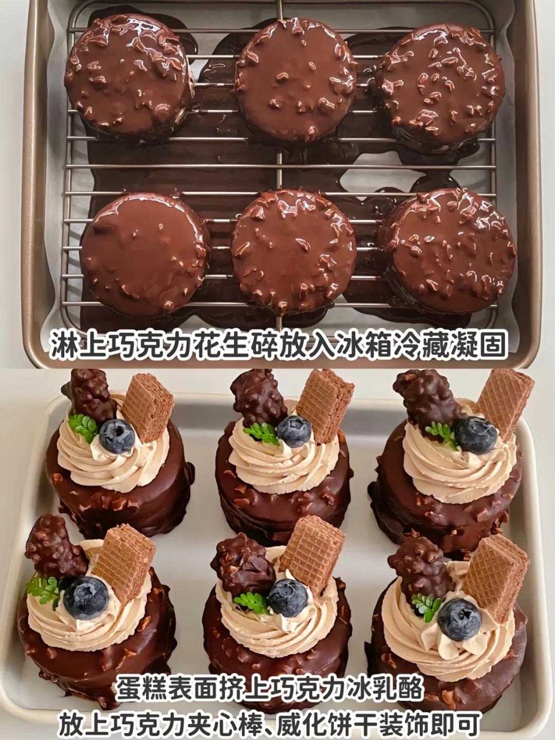 7⃣️蛋糕表面淋上一层巧克力花生碎放入冰箱冷藏凝固,表面挤上冰酪奶油放上巧克力威化➕巧克力夹心棒➕装饰