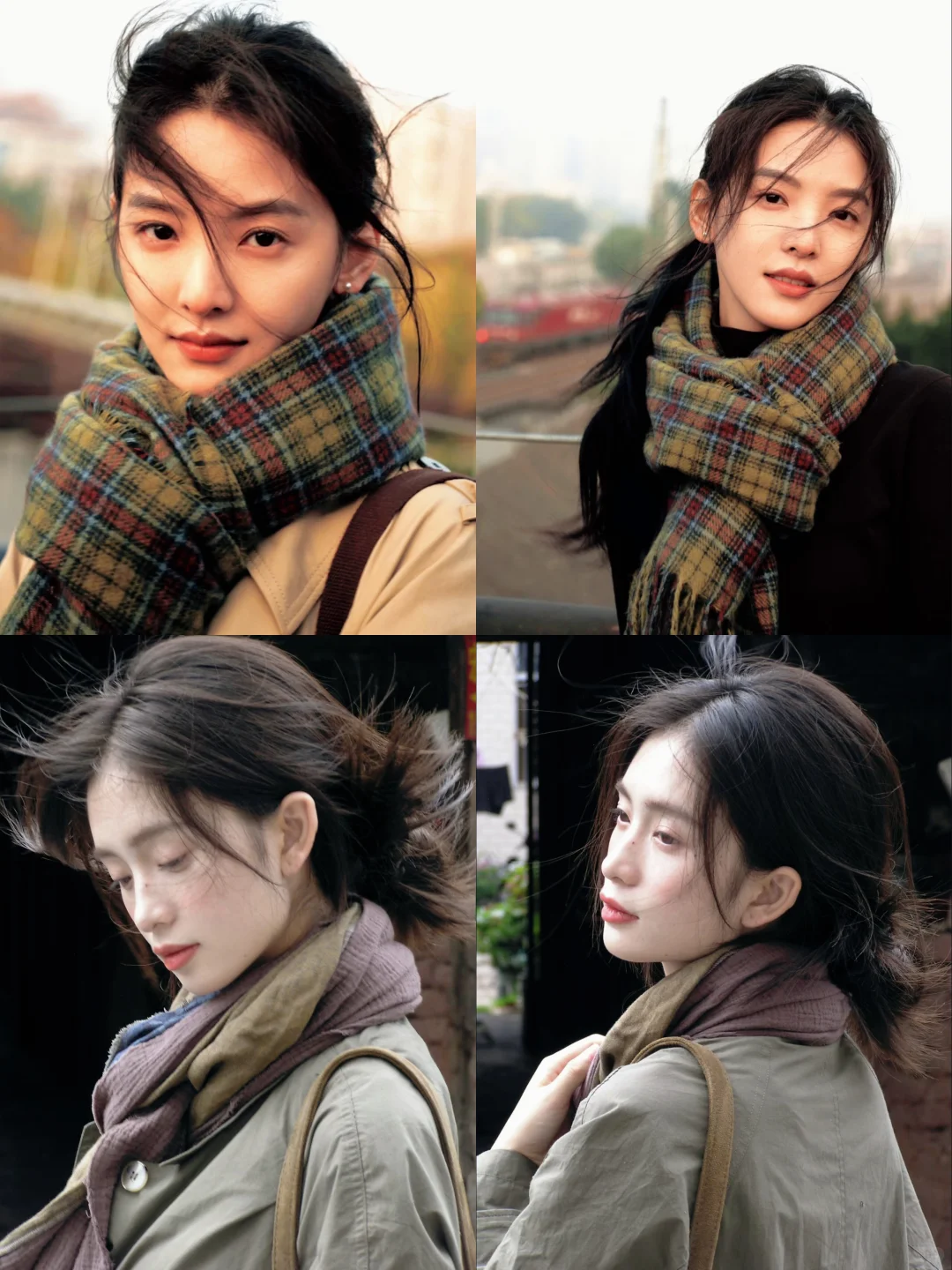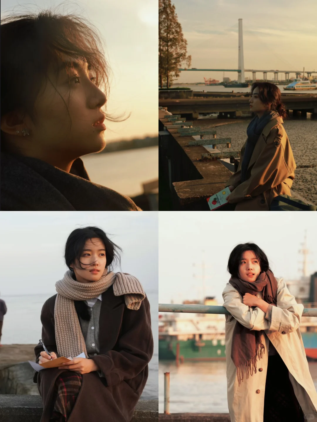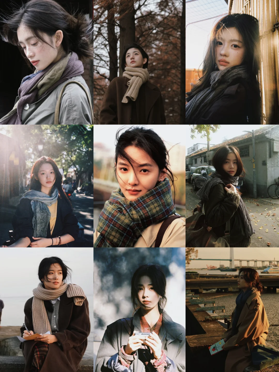 风衣;书本;同色系围巾;头发丝是氛围感之神!整体美拉德色系更出片喔~