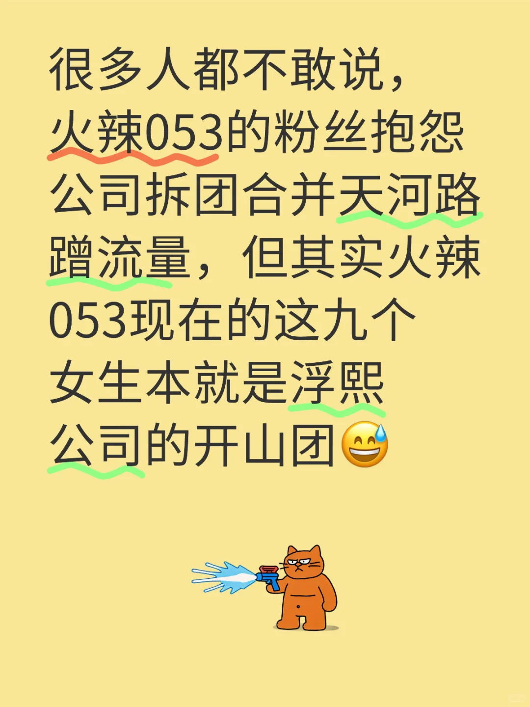 前段时间火辣053拆团合并天河路,053粉丝抱怨天河路蹭流量,甚至还有跑到053主播评论里造谣天河路主播的,但有谁懂053留下的成员➕天河路进来的成员(欣爷喵喵紫紫白桃玛丽洋五龟龟可乐九九)本就是浮熙开山团,九个女孩用素颜团播把最高流量干到万人,也是因为公司吃相难看,在满月那天被拆团带新人,才有了后来的天河路和053。。
