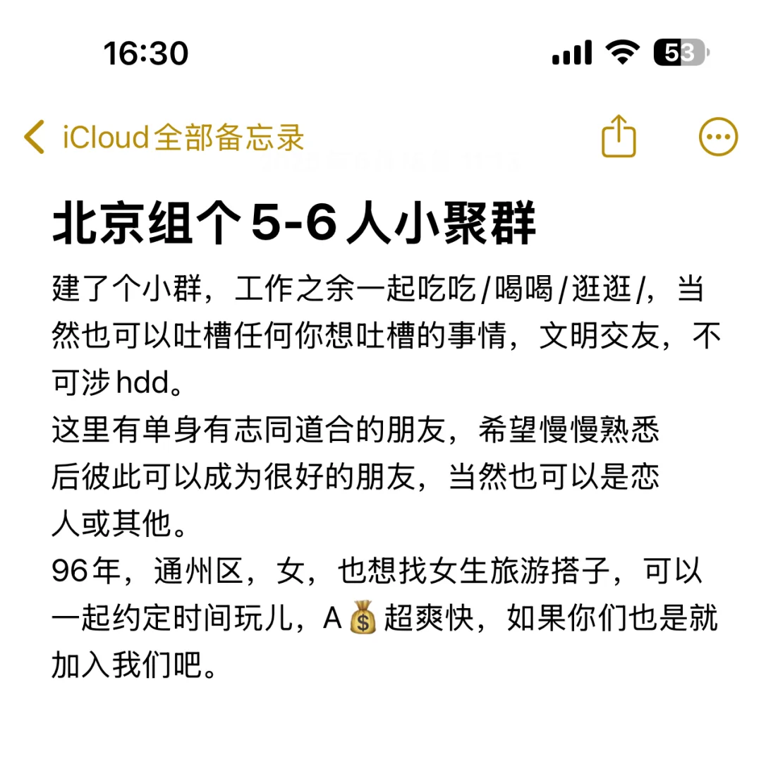 96年,通州区,女,也想找女生旅游搭子,可以一起约定时间玩儿,A💰超爽快,如果你们也是就加入我们吧。