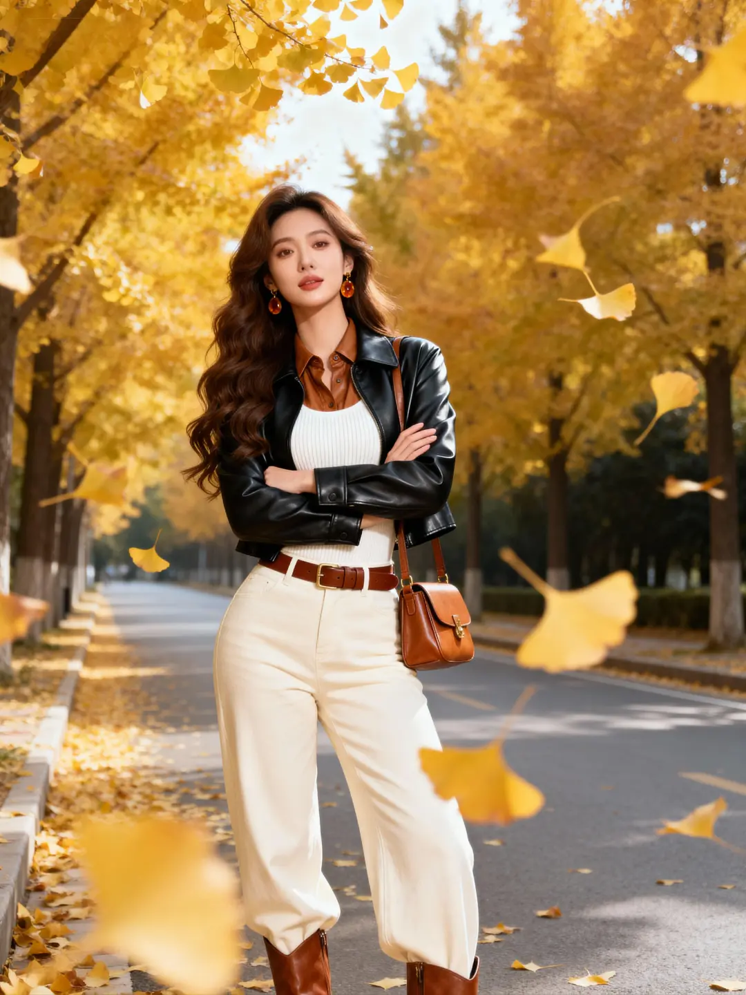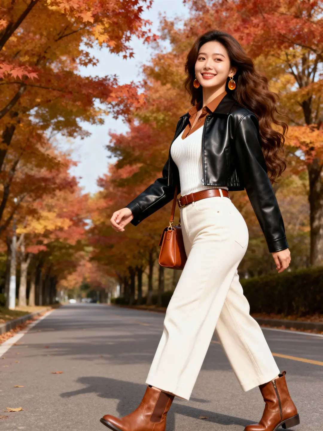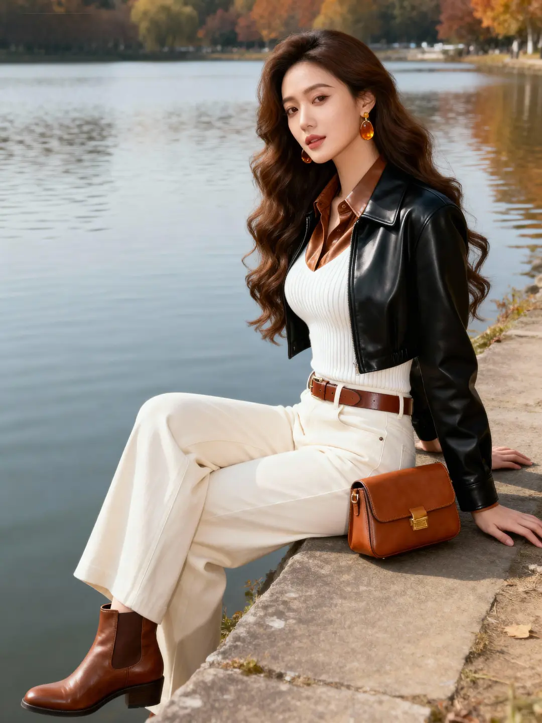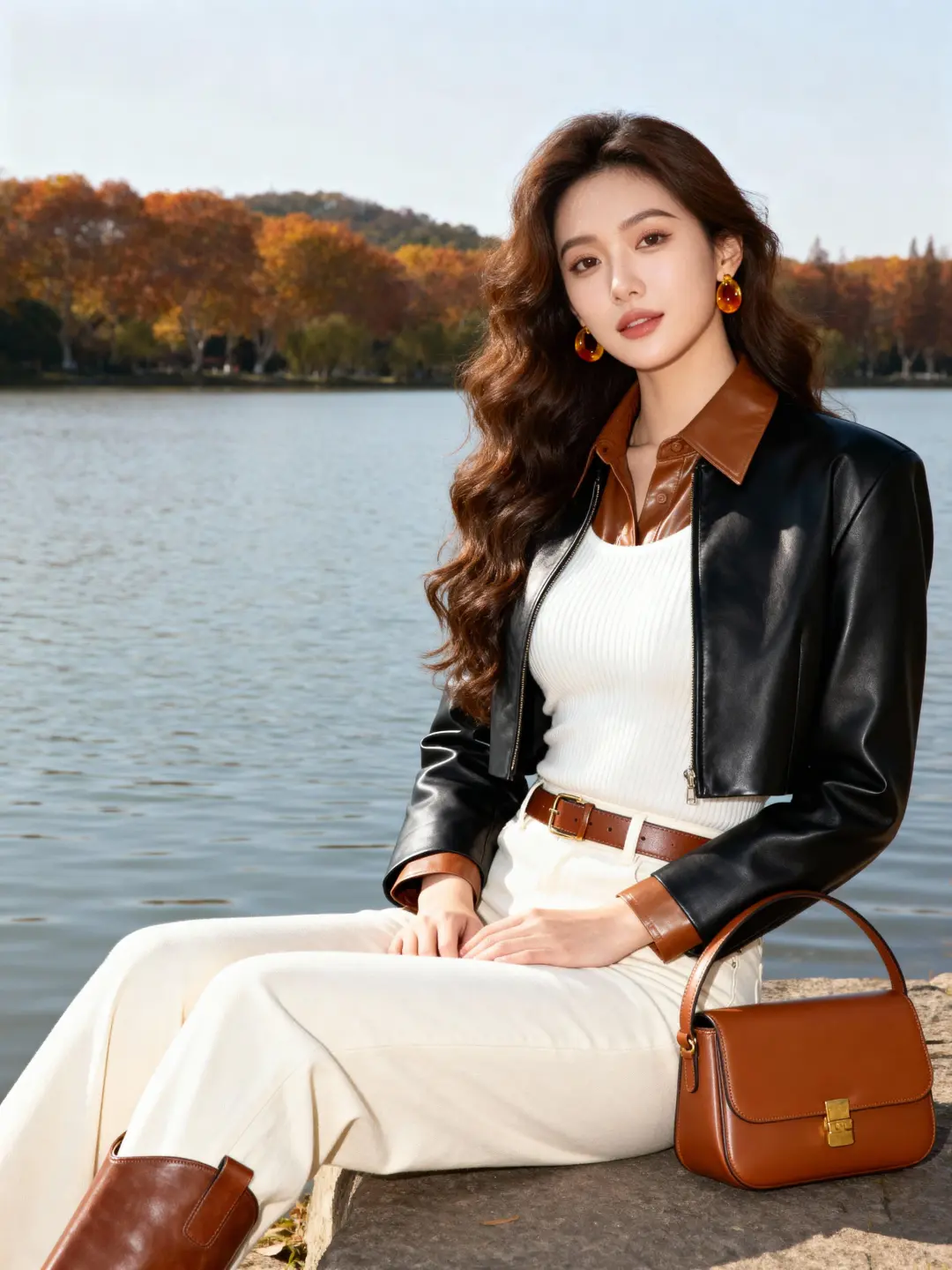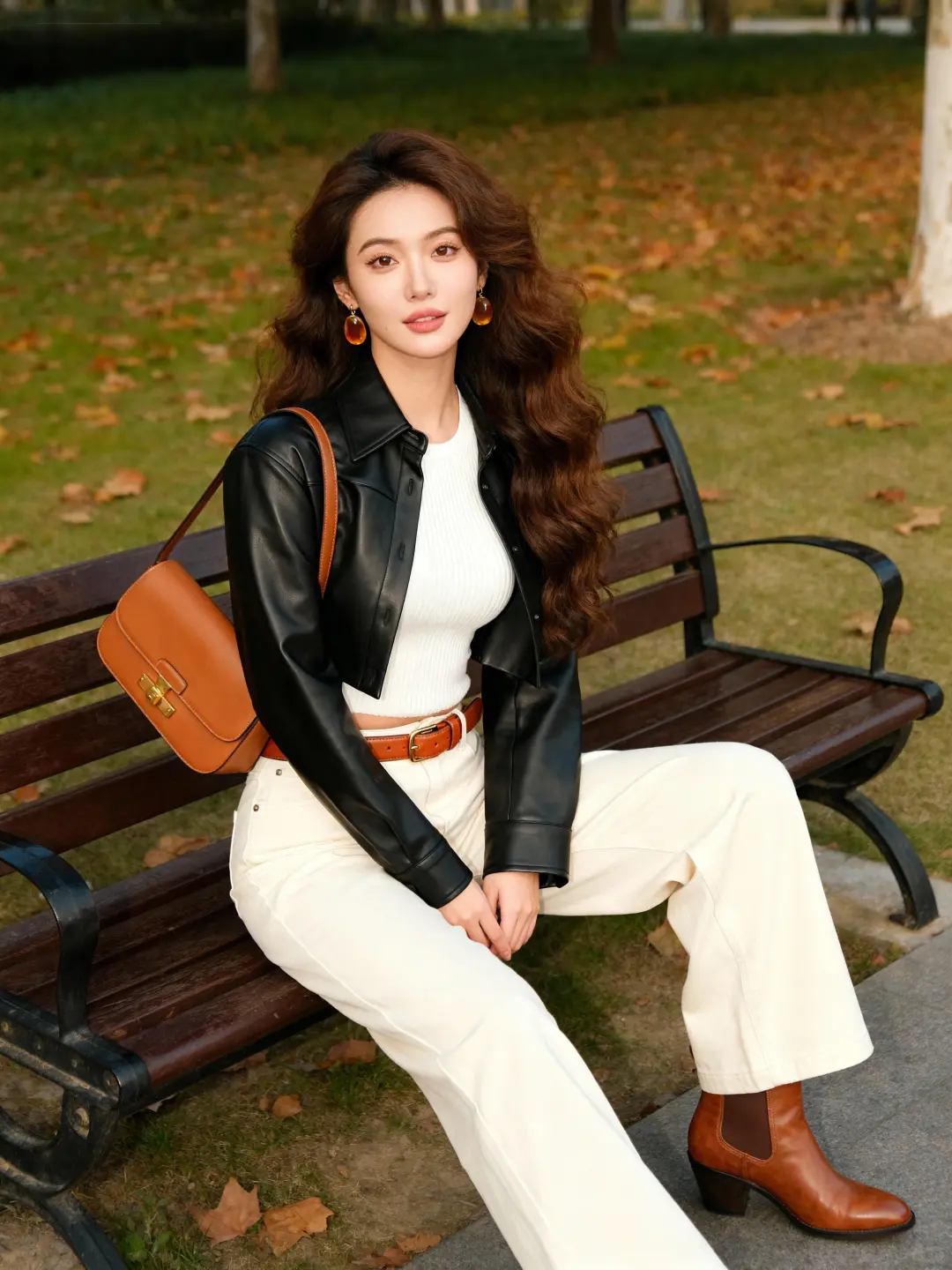 焦糖棕就像一杯太妃糖拿铁!皮质和针织的材质碰撞很有层次,搭配浅色裤子就不会沉闷,复古又时髦。