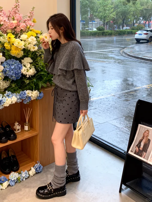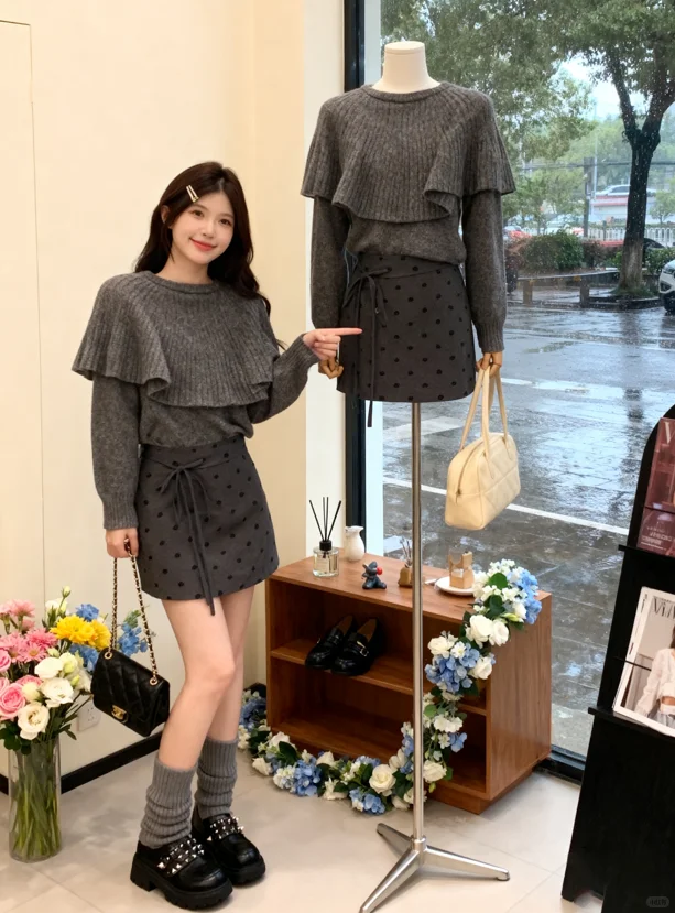 旁边的人体模特也穿着同款灰色荷叶边毛衣与波点短裙,模特手中提着一只米色的手提包,下方的木质置物架上摆放着一双黑色皮鞋,架子上层还有香薰瓶、小摆件等,边缘缠绕着蓝白相间的花朵,增添了浪漫感。