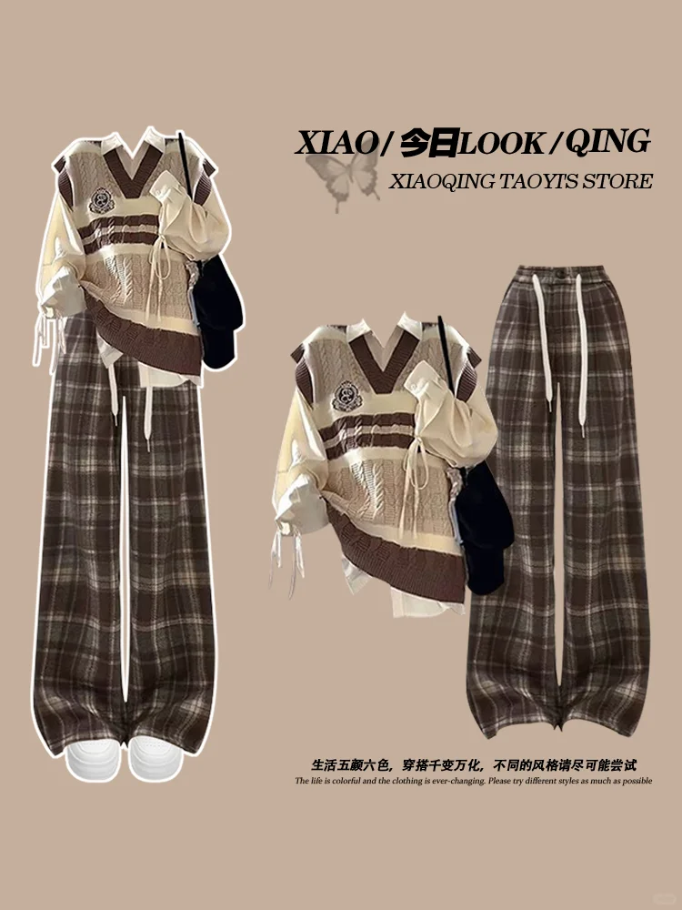 Look2⃣:棕色格子休闲裤+杏色系带衬衫+咖色针织马甲
