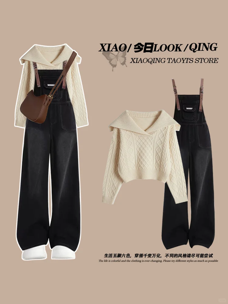 Look6⃣:浅杏色毛衣+黑色背带裤