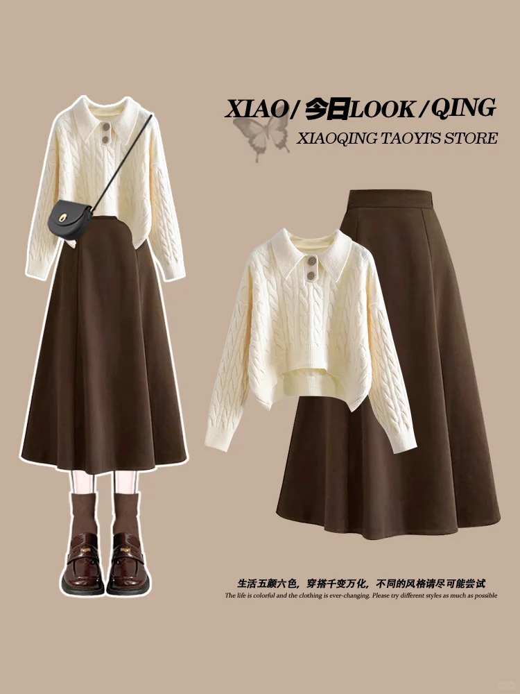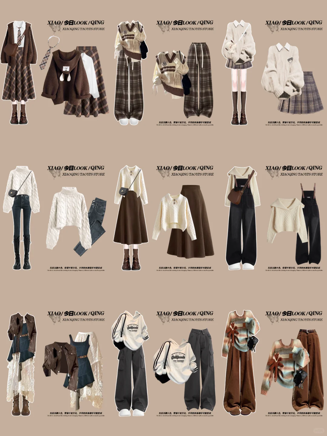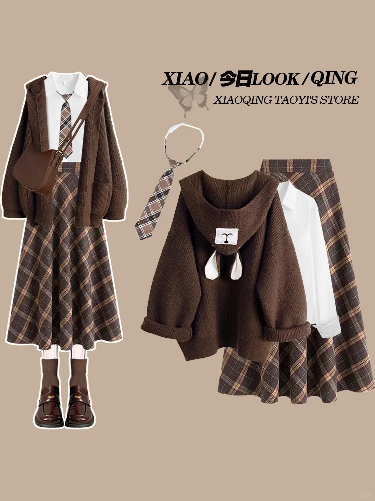 Look1⃣:咖色开衫+白色衬衫+棕色领带+咖色格子半身裙