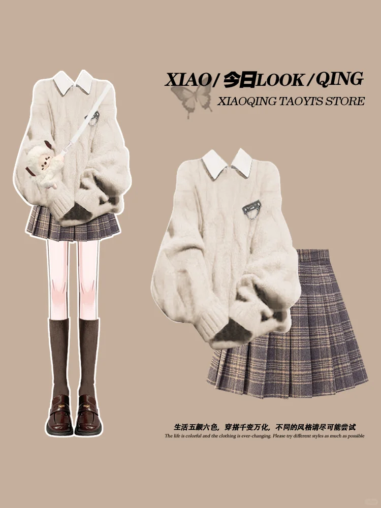 Look3⃣:杏色毛衣+白色衬衫+格子百褶裙