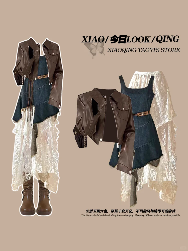 Look7⃣:深棕色外套+蓝色牛仔裙配腰带+杏色蕾丝裙