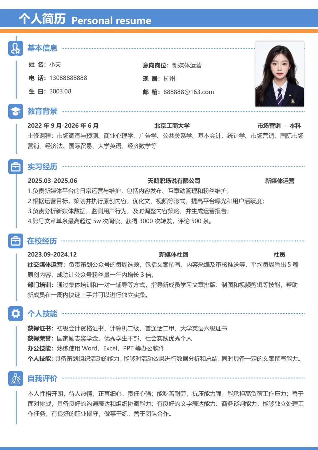 合理设置模块,包括基本信息、教育经历、工作/实习经历、项目经验、专业技能、荣誉奖项等,避免杂乱无章。