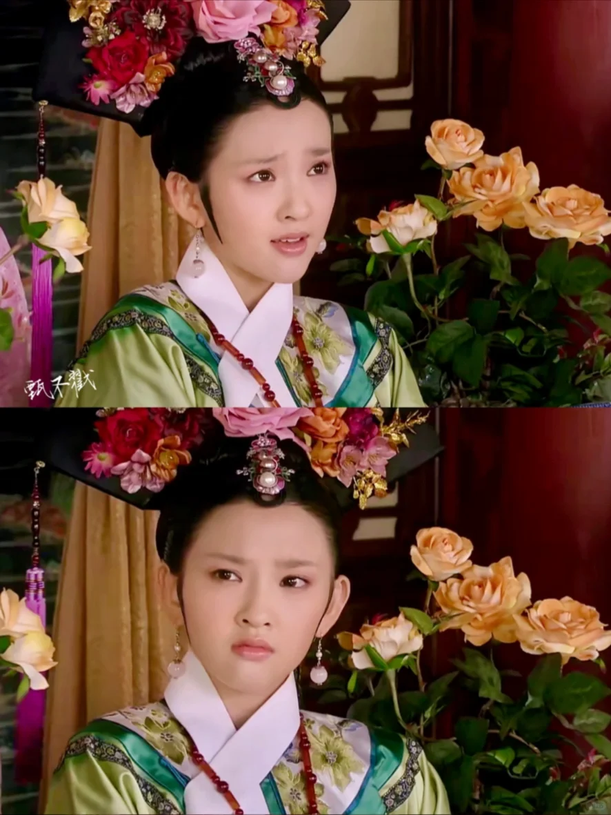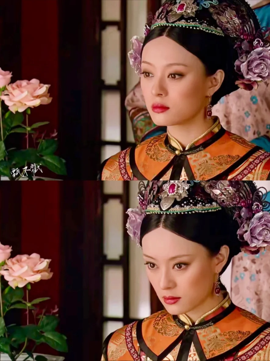 🌸华妃旁边的花是玫粉色,也有明亮的黄色,开得娇艳欲滴,正如她的金句一样:做人一定要花团锦簇,轰轰烈烈才好。