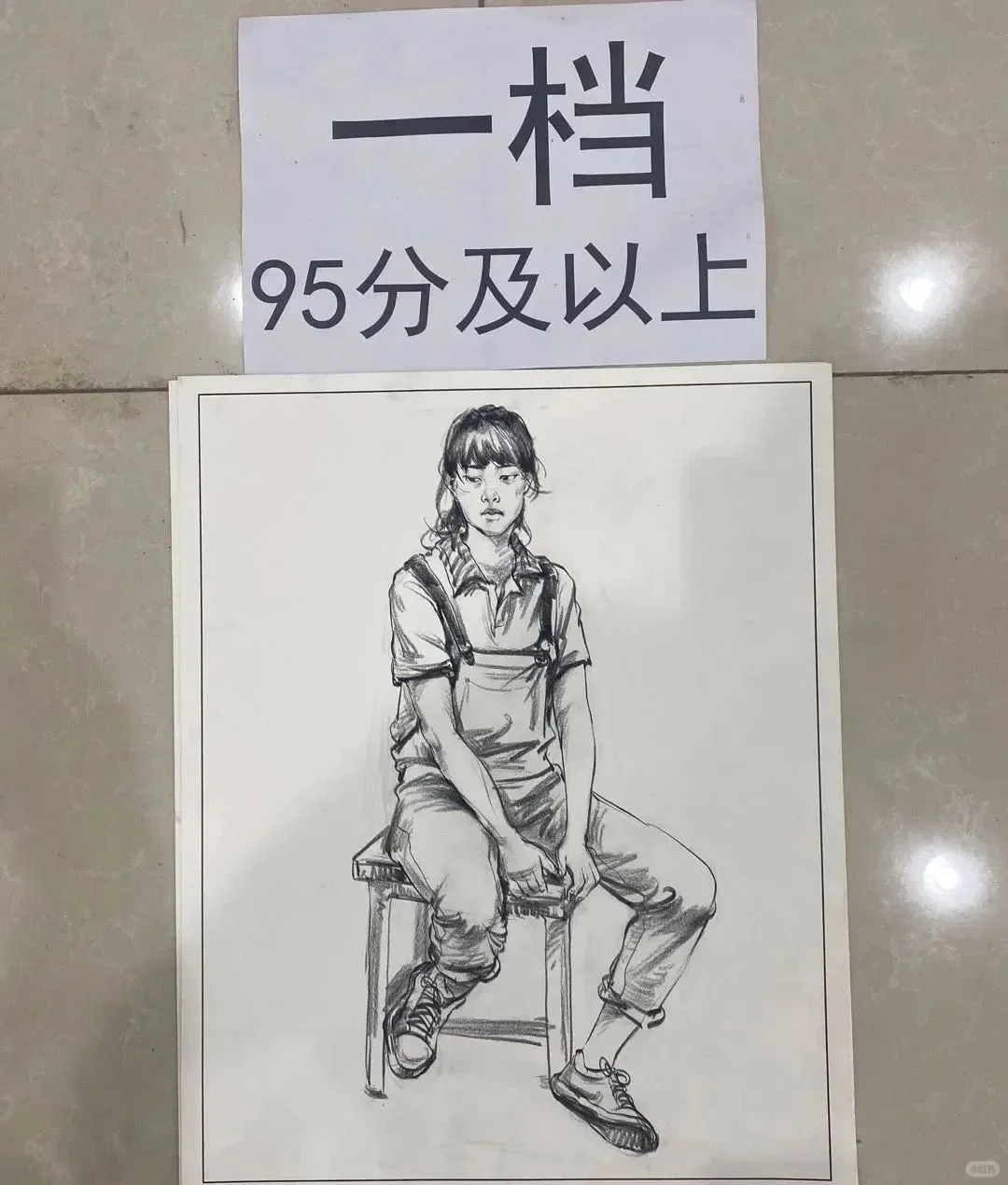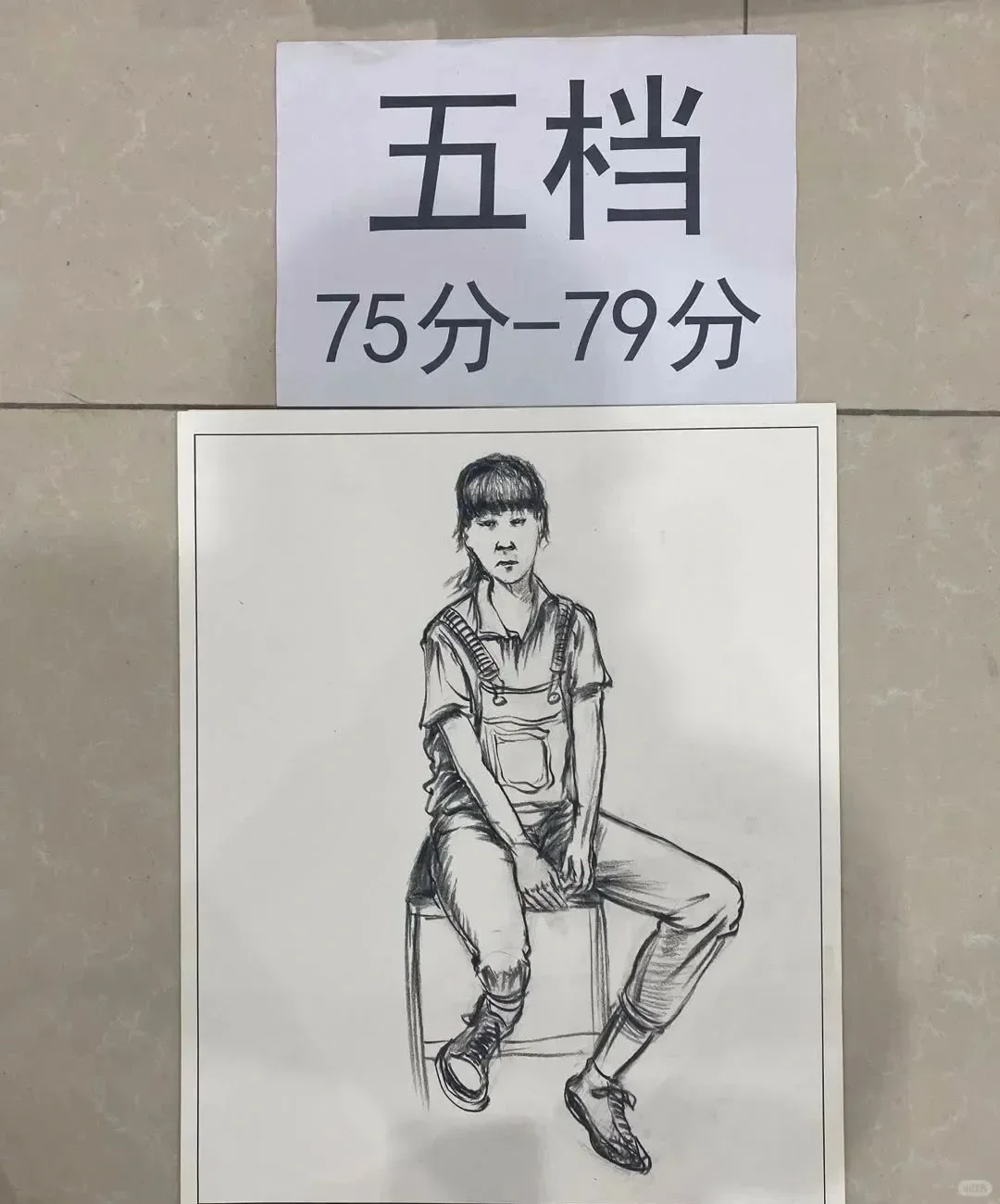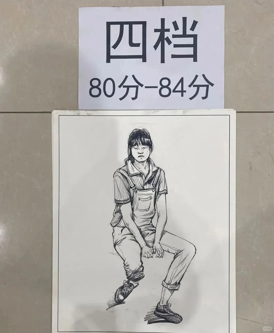 3档:120分-124分。 ♦️100分制则是80~84分。 点评:构图完整,比例结构相对准确,动态相对自然,头手脚刻画基本到位,用笔用线流畅肯定基本连贯,整体画面完整。