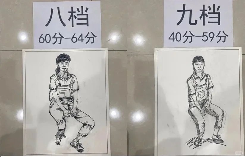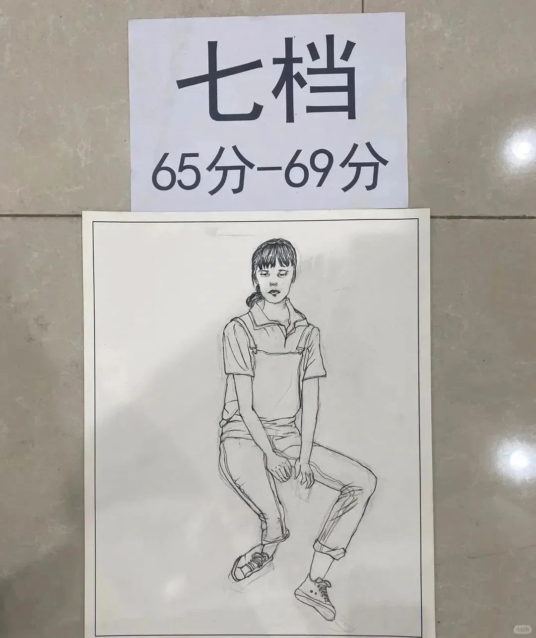 7档:100分-104分。 ♦️100分制则是60分以下。 点评:画面效果差,造型不准确,线条混乱,基本关系有问题,对速写的理解明显不足,训练量不够,还需要加强基础!
