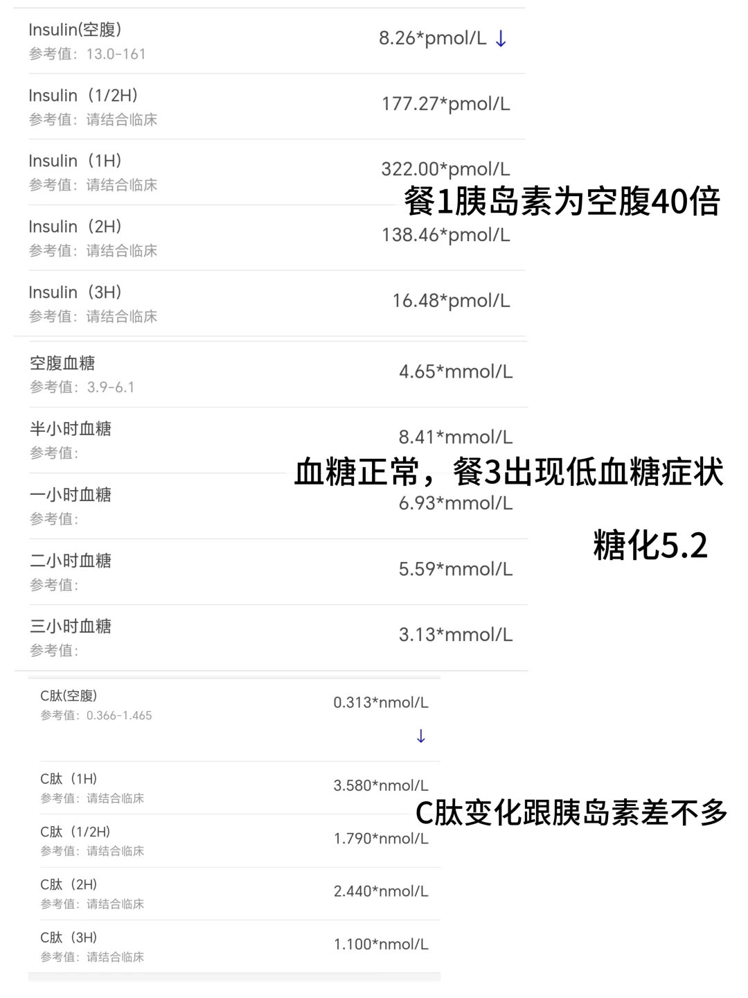认为没有胰岛素抵抗,峰值正常,只是一下子吃了太多纯的糖水导致餐一分泌的多些并引起餐三低血糖。二甲双胍、吡格列酮都不要吃,且认为我没有多囊(看了几次瑞金的b超,说只是单侧卵泡多,不能构成多囊条件,我忘记给他看之前红房子的结果了)同时雄激素也不高,月经不规律只是因为工作压力大+熬夜,如果3个月不来那才需要吃地屈孕酮。告诉我要早睡早起,正常吃饭,少食多餐,吃得慢一些,保持愉悦心情。维D和运动也是可以的。