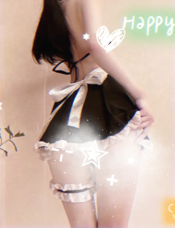 木耳边小围领搭配黑色蝴蝶结,绑带文胸也搭配了白色木耳边,与黑色牛奶丝相呼应,舒适又纯欲