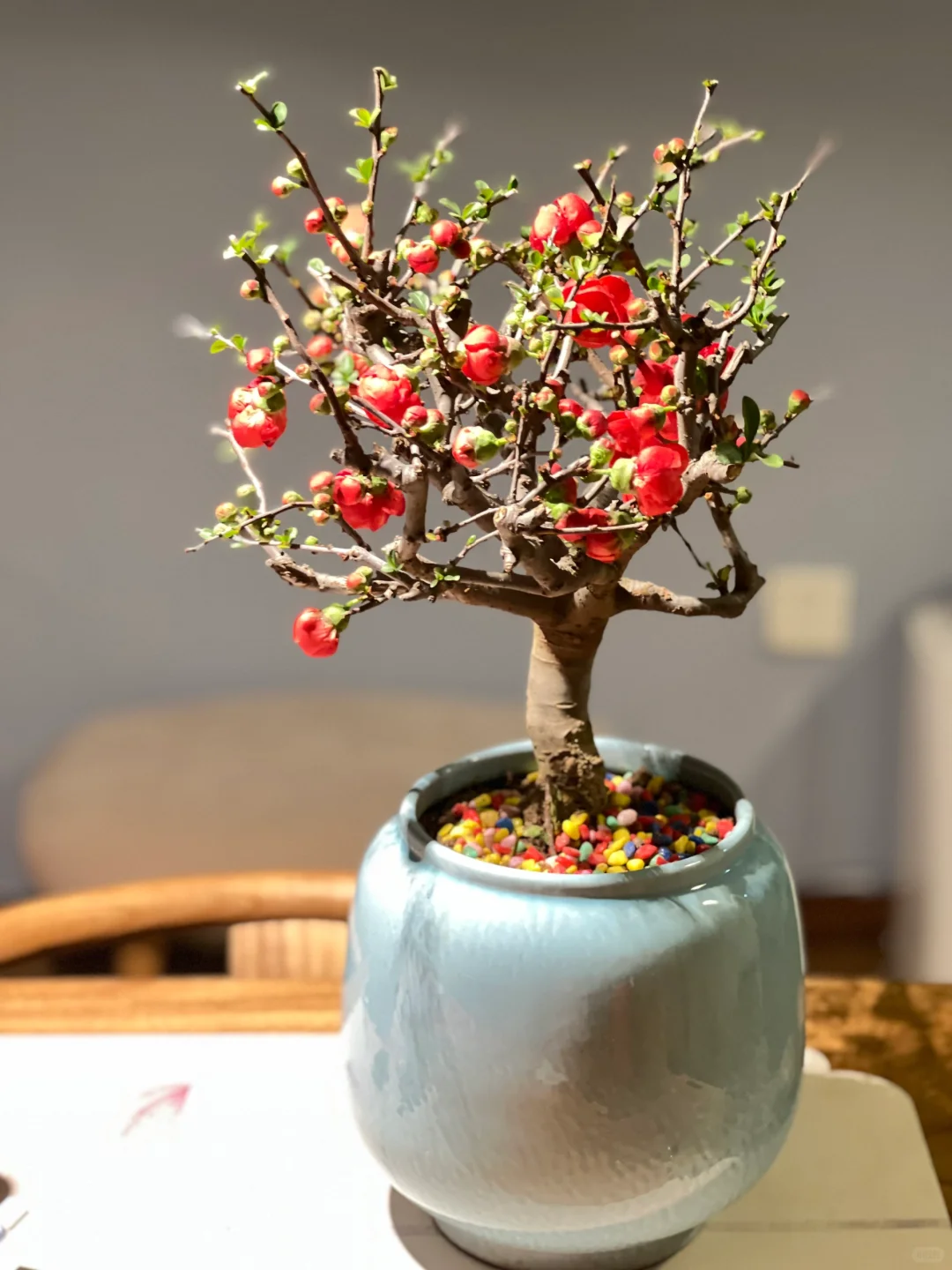 后来我们抱走了一大盆造型像问号一样的枫叶和粗粗大大的海棠,早起醒来就有大叶子歪过来,呈现出一种空间错落的妙感。海棠也很争气,到家就开花,妖妖媚媚红彤彤一大片。