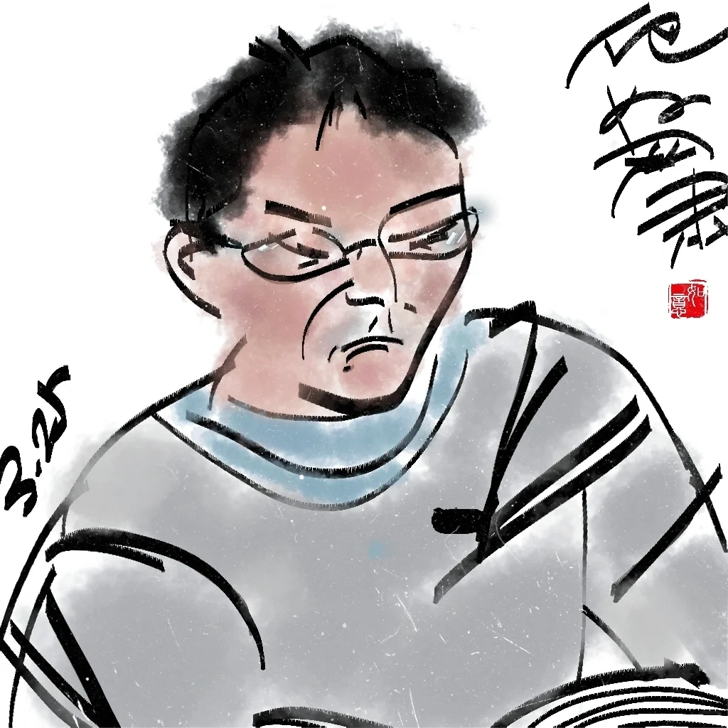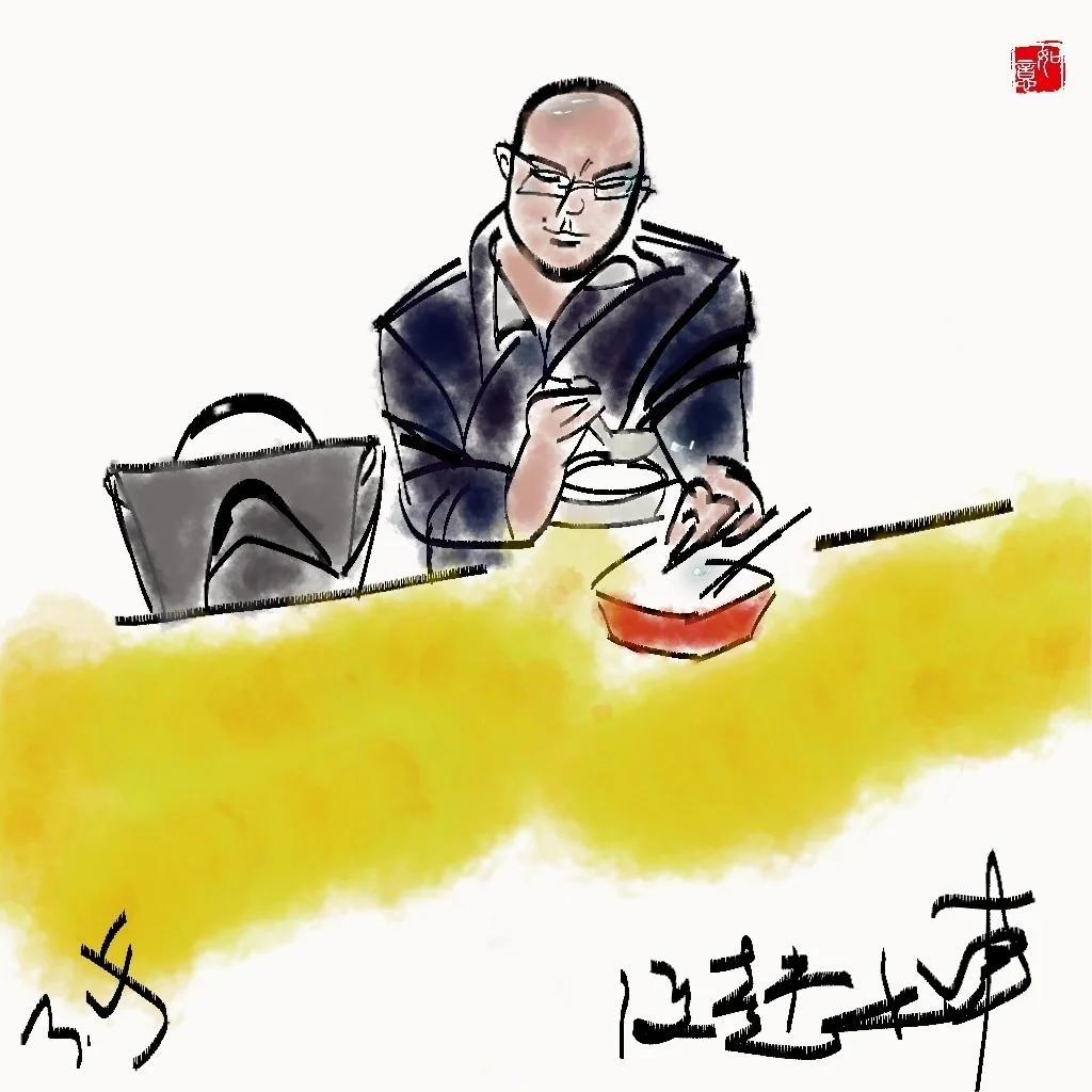 火车站改签后时间变得富裕,倦怠的老躯体坐在一个铺子里对着个吃了三根油条的秃头大哥发愣,百无聊赖中画了个速写。到目的地后开了很久的会,看到对面高颧骨会计师不苟言笑的脸,觉得好玩,就又成稿一张。