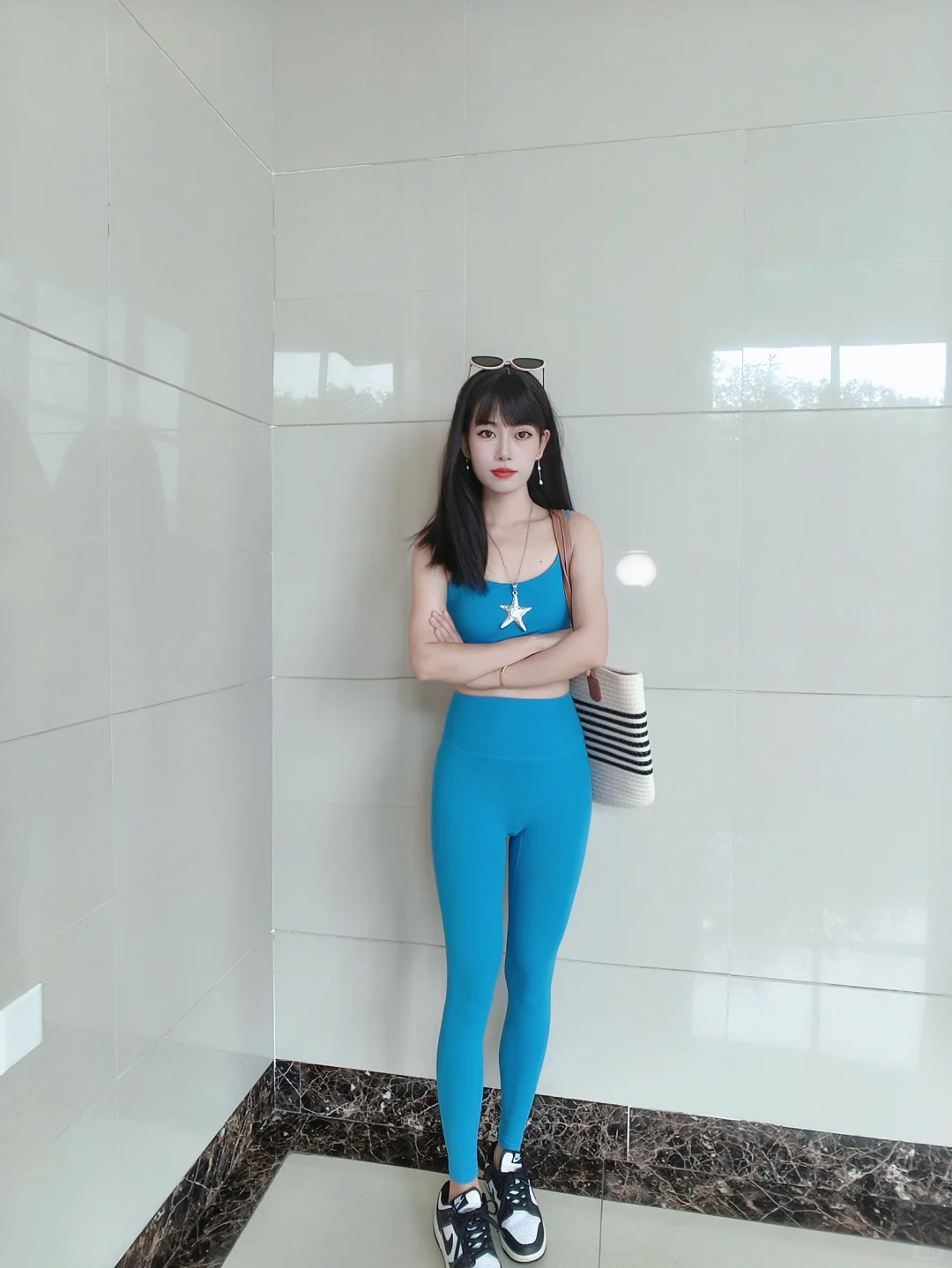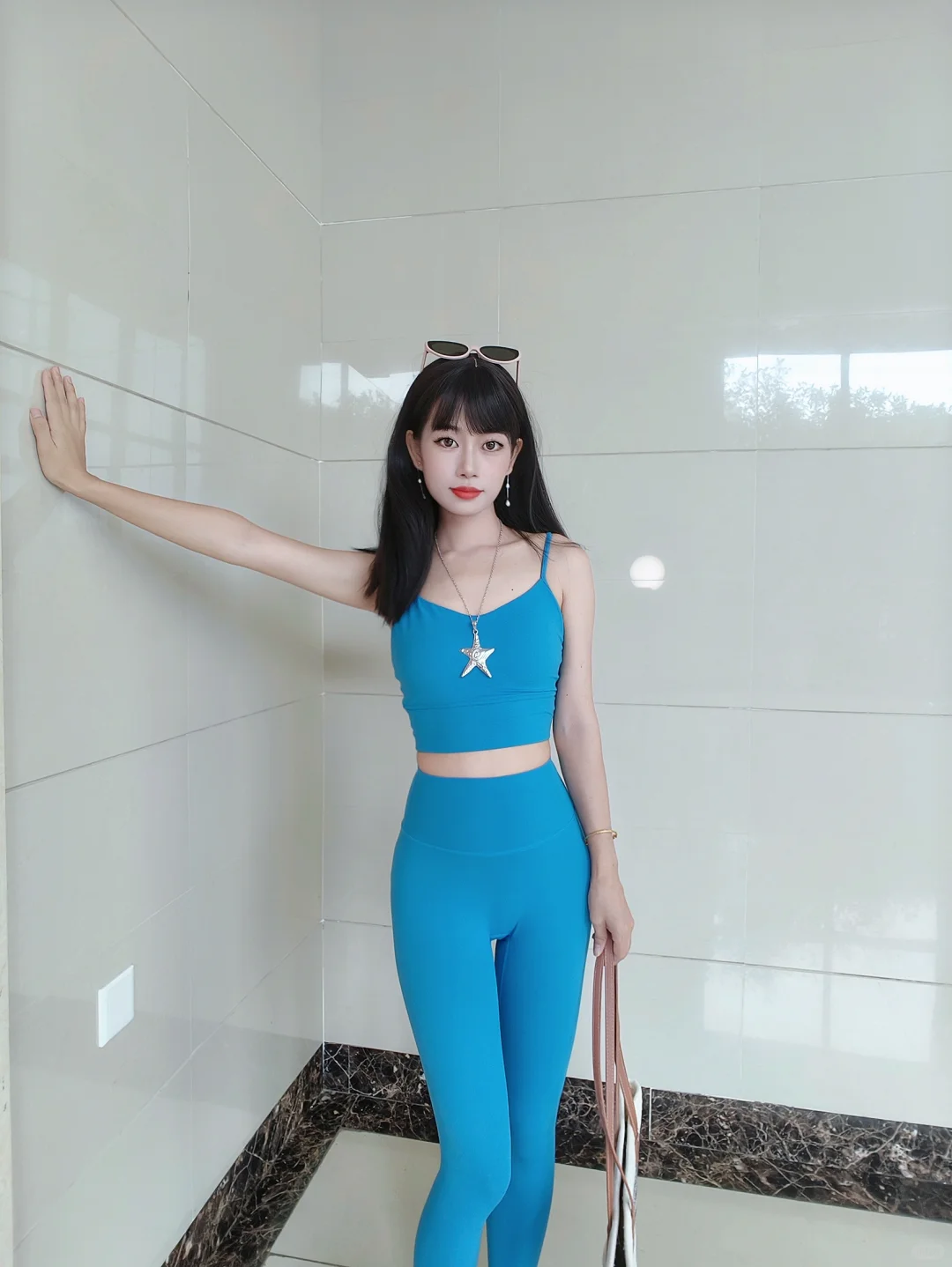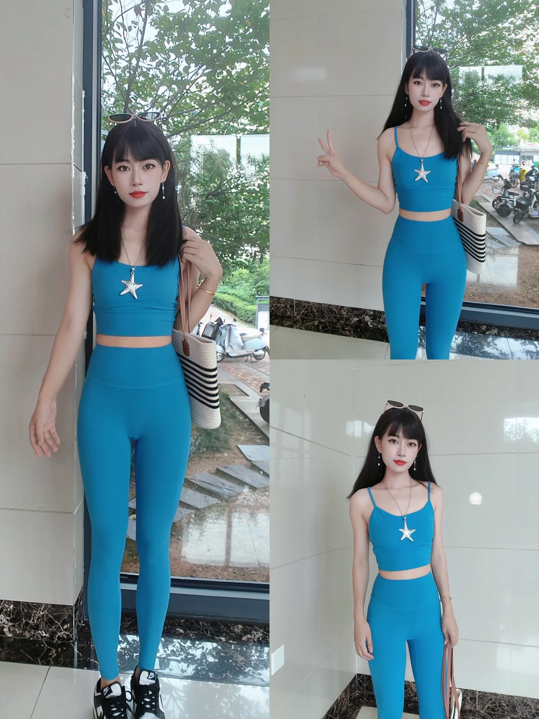 这组套装的蓝,像加了灰调的莫兰迪色系,饱和度柔和,对黄皮超友好,是显白天花板!吊带与瑜伽裤的剪裁极尽贴合,赋予身体最大的伸展自由度,出汗也能保持清爽体面。