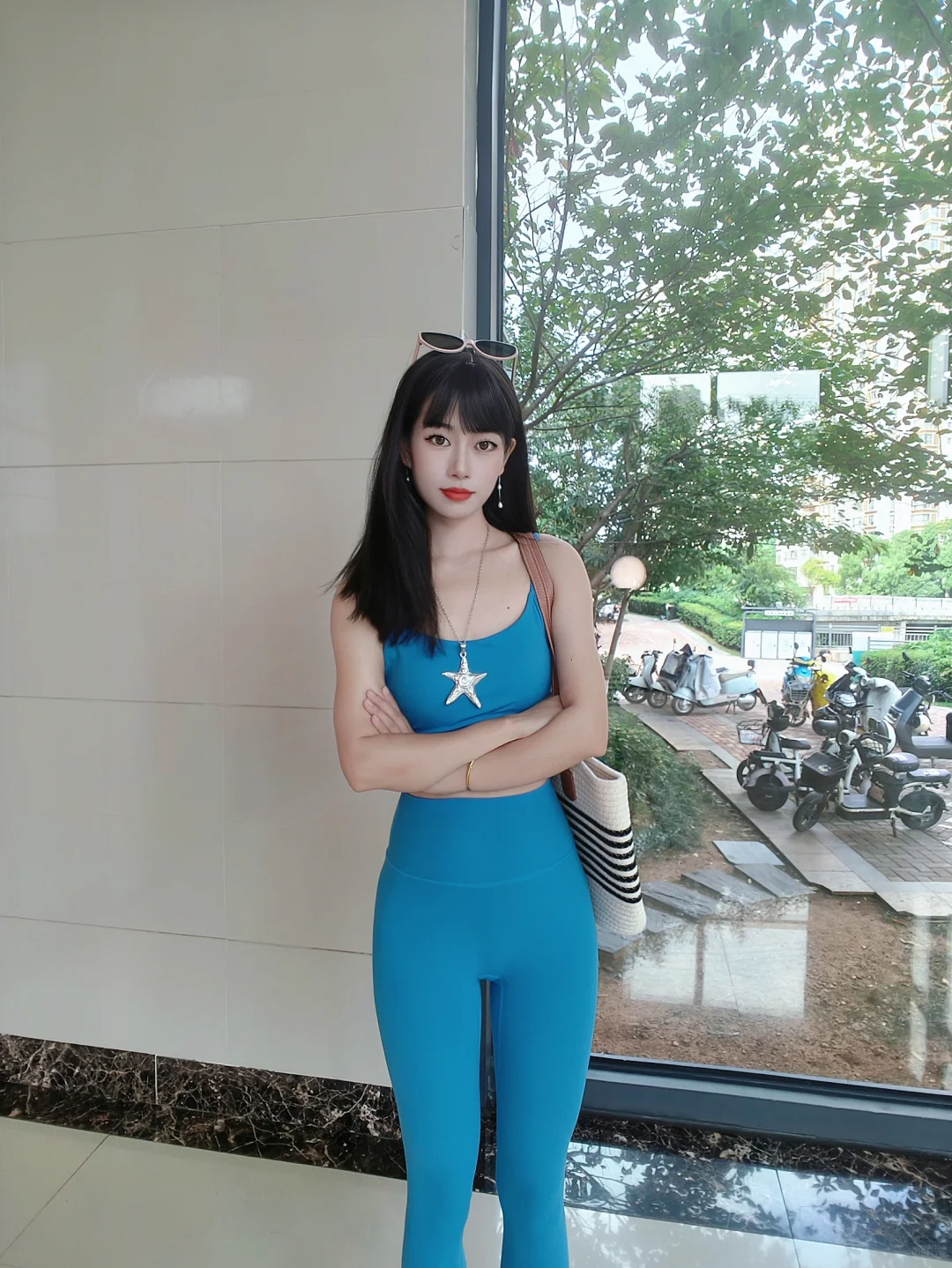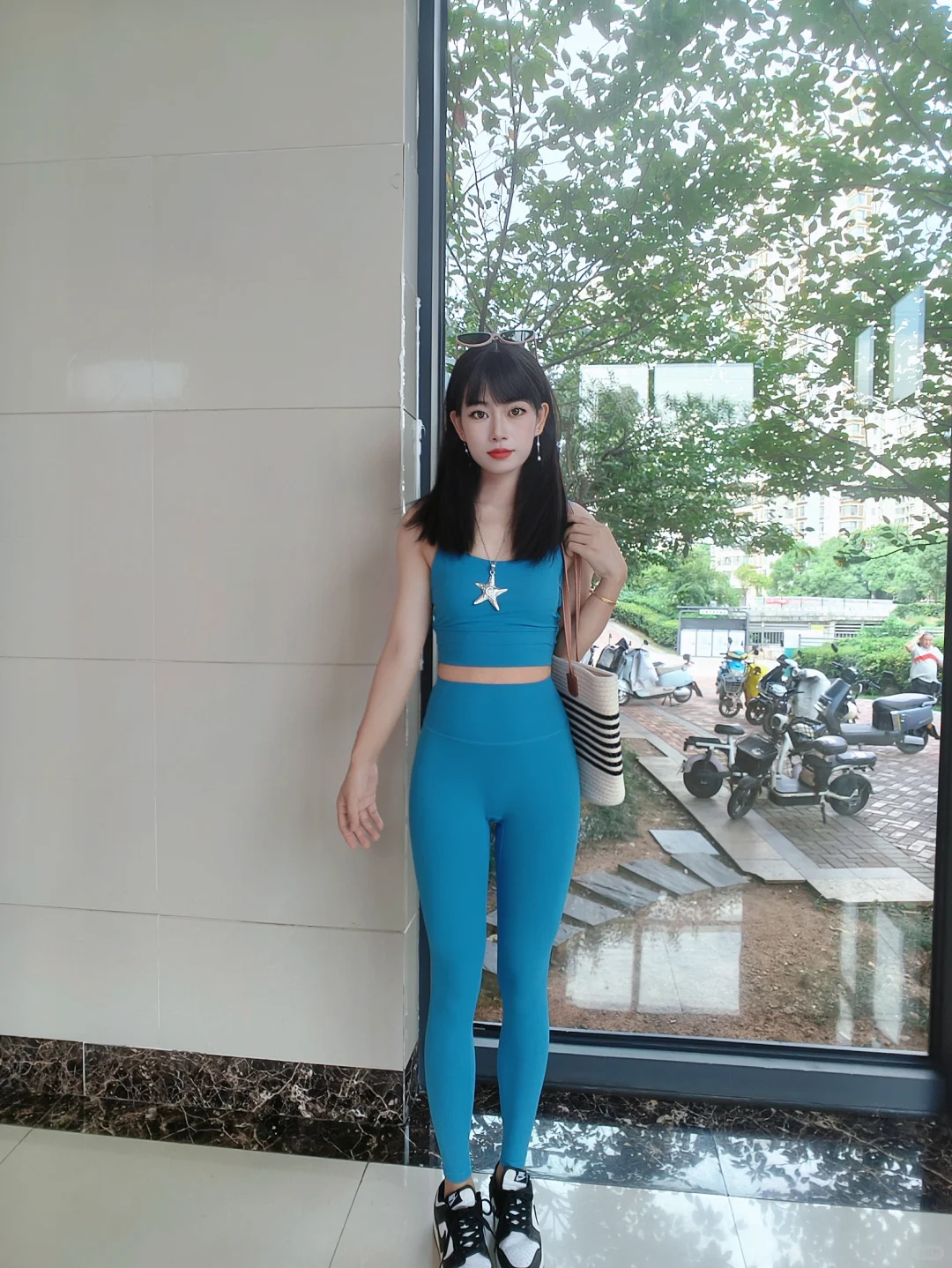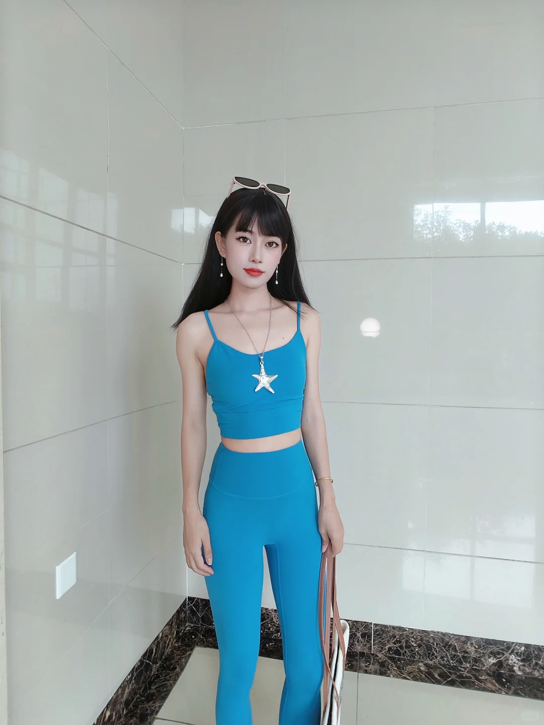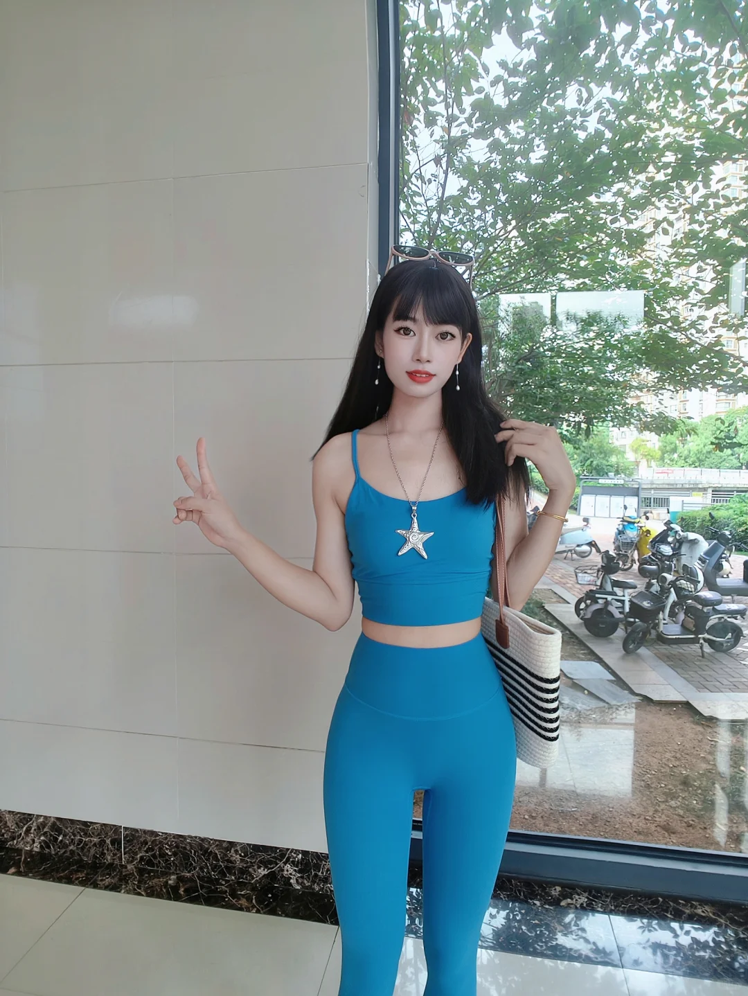 这组套装的蓝,像加了灰调的莫兰迪色系,饱和度柔和,对黄皮超友好,是显白天花板!吊带与瑜伽裤的剪裁极尽贴合,赋予身体最大的伸展自由度,出汗也能保持清爽体面。