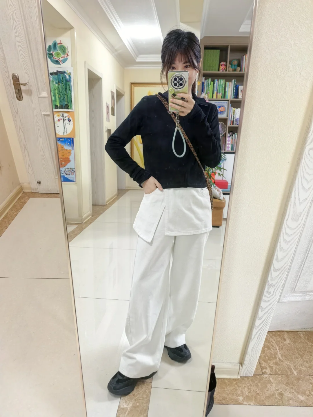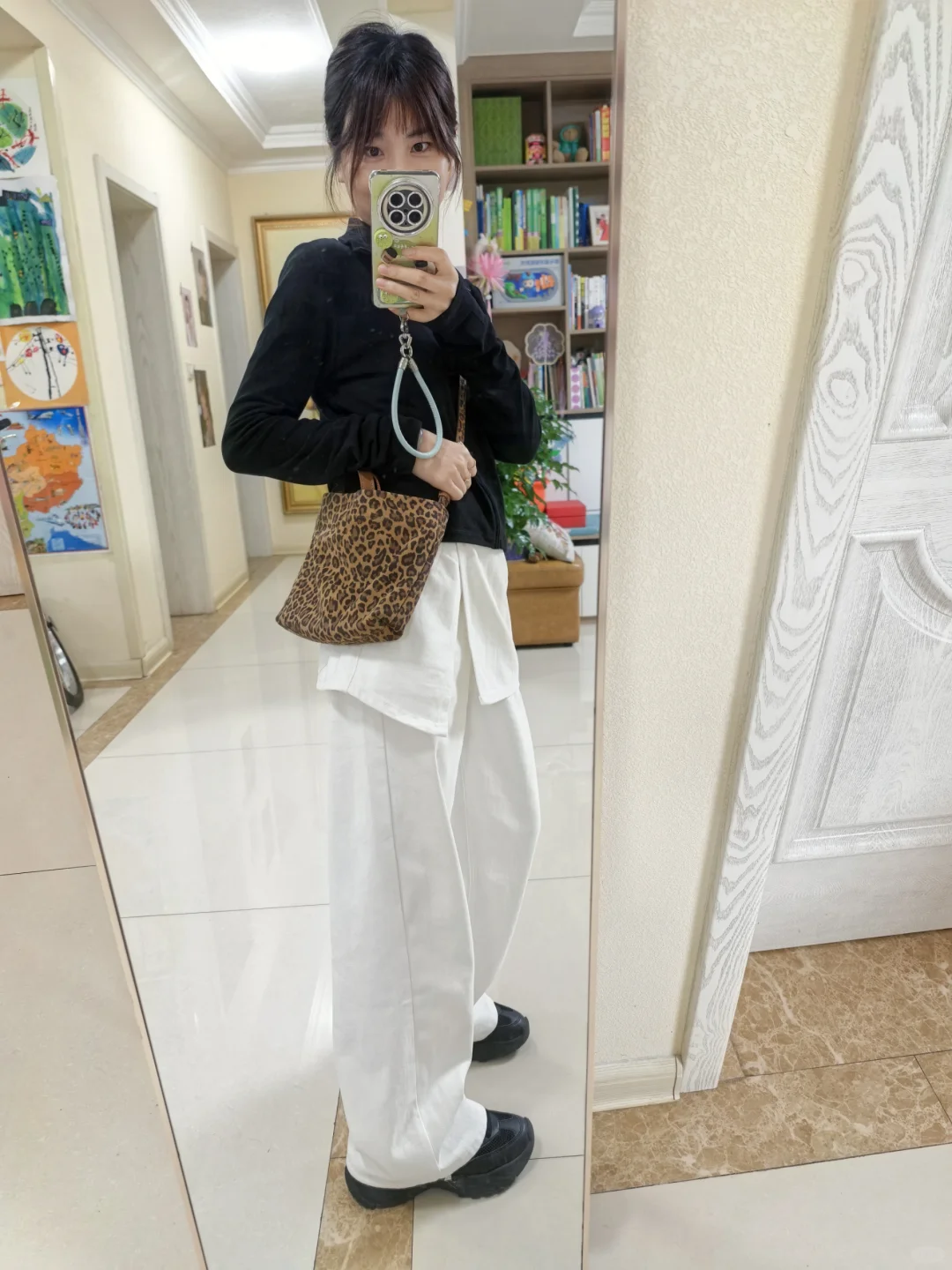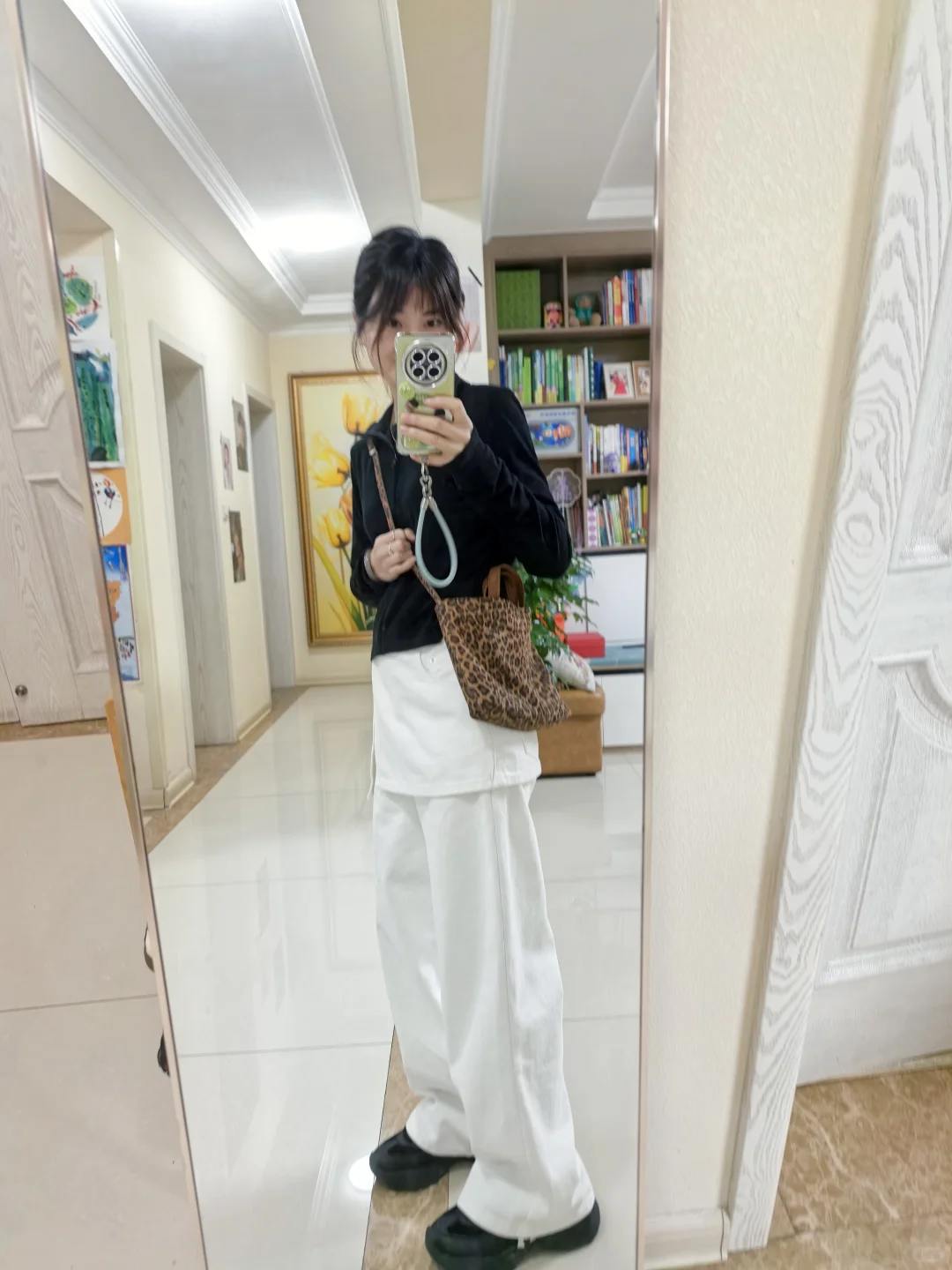 瑜伽服+白色磨毛牛仔裤(屁帘也是裤子带的可以拆下来)+黑色老爹鞋+豹纹包包(我的心头爱)