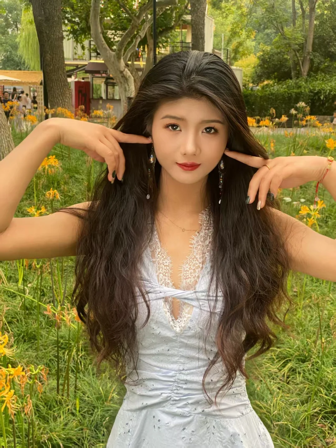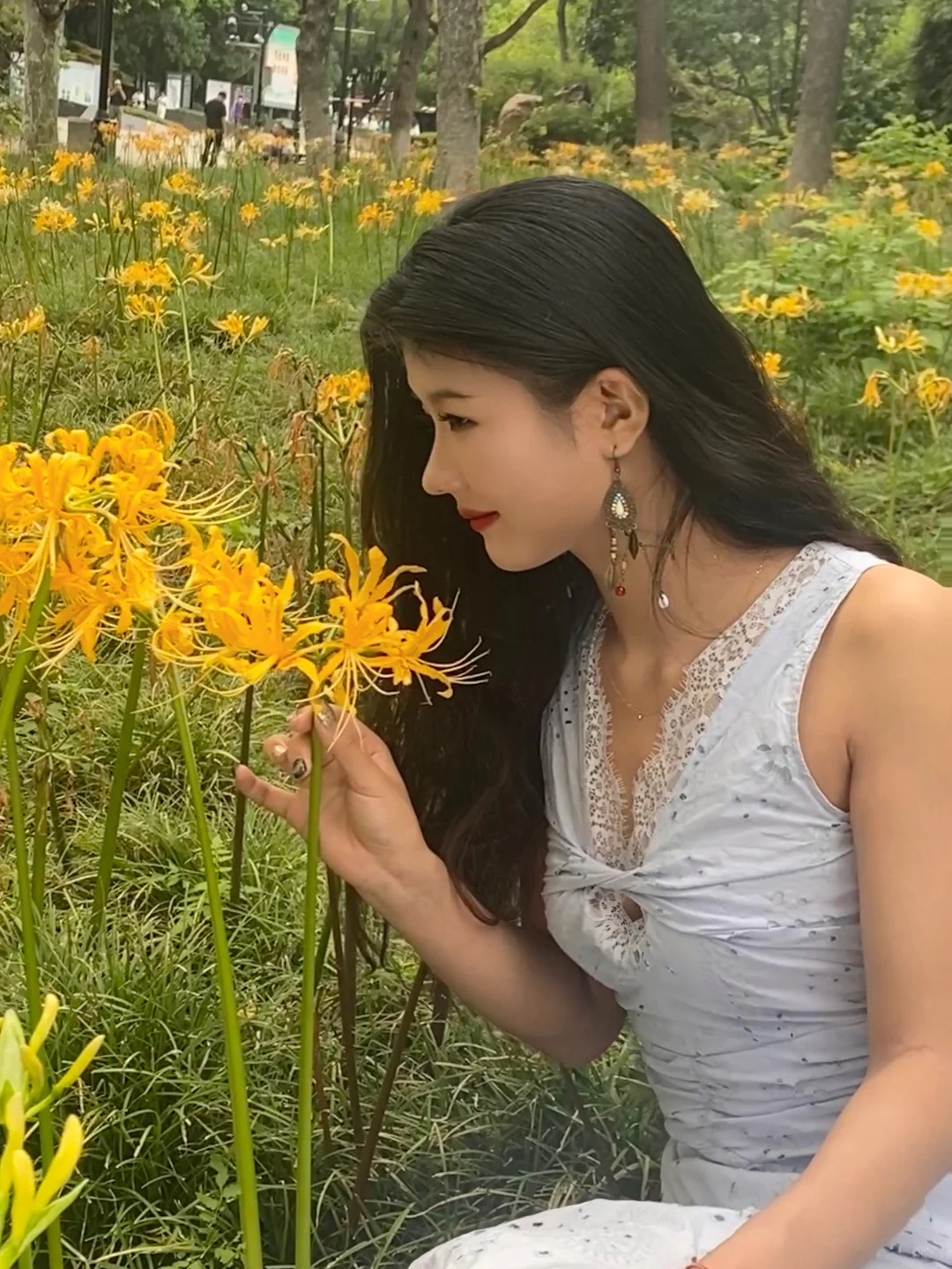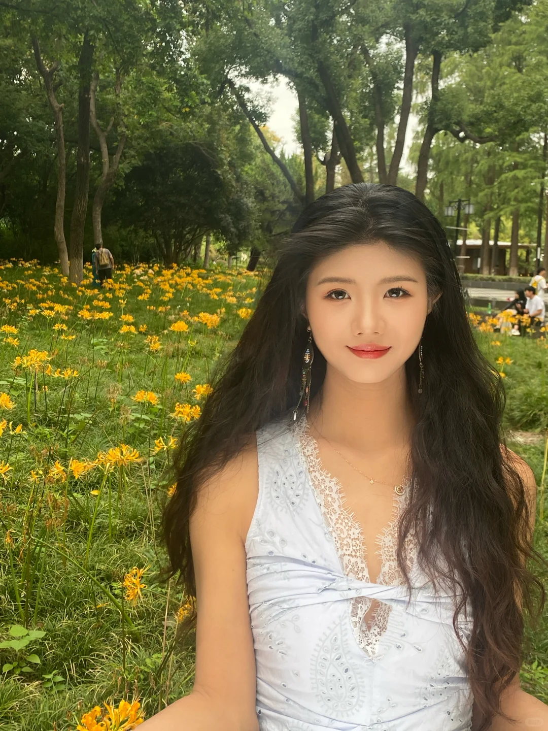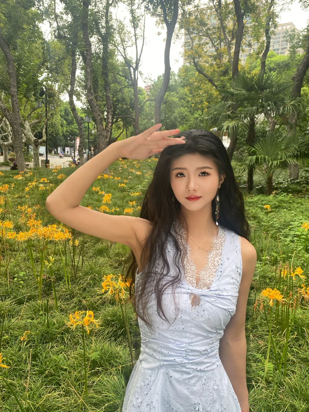 浅蓝蕾丝裙+慵懒大波浪,在黄花花海拍了组封神照!