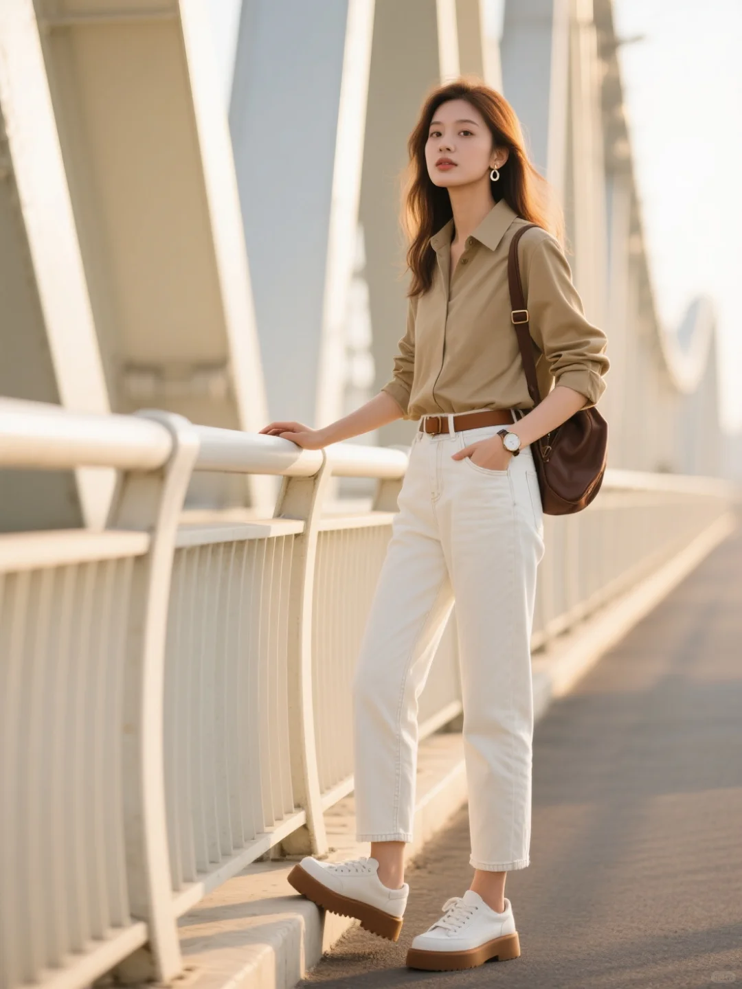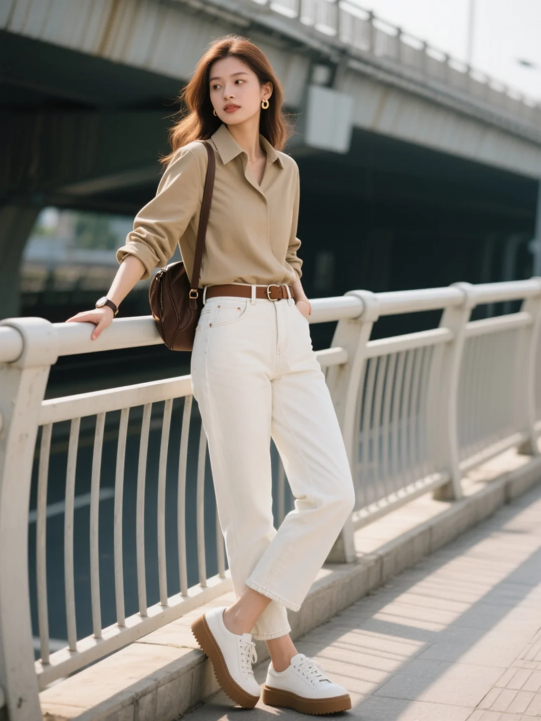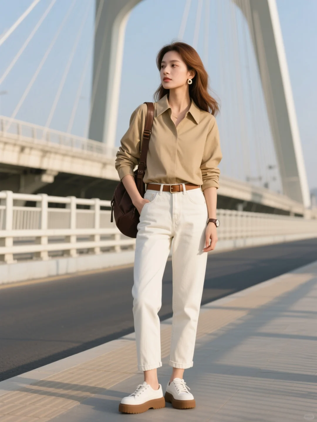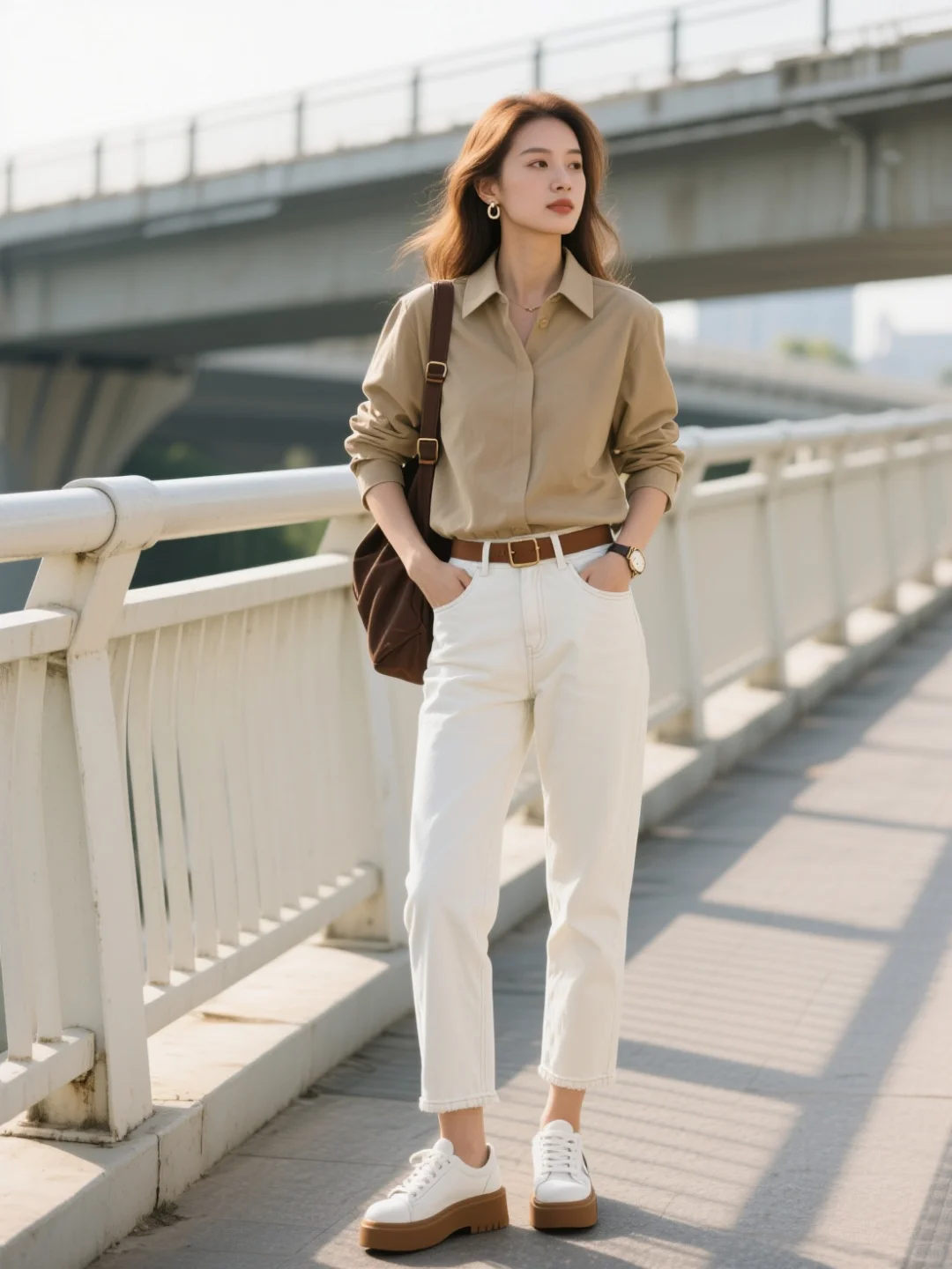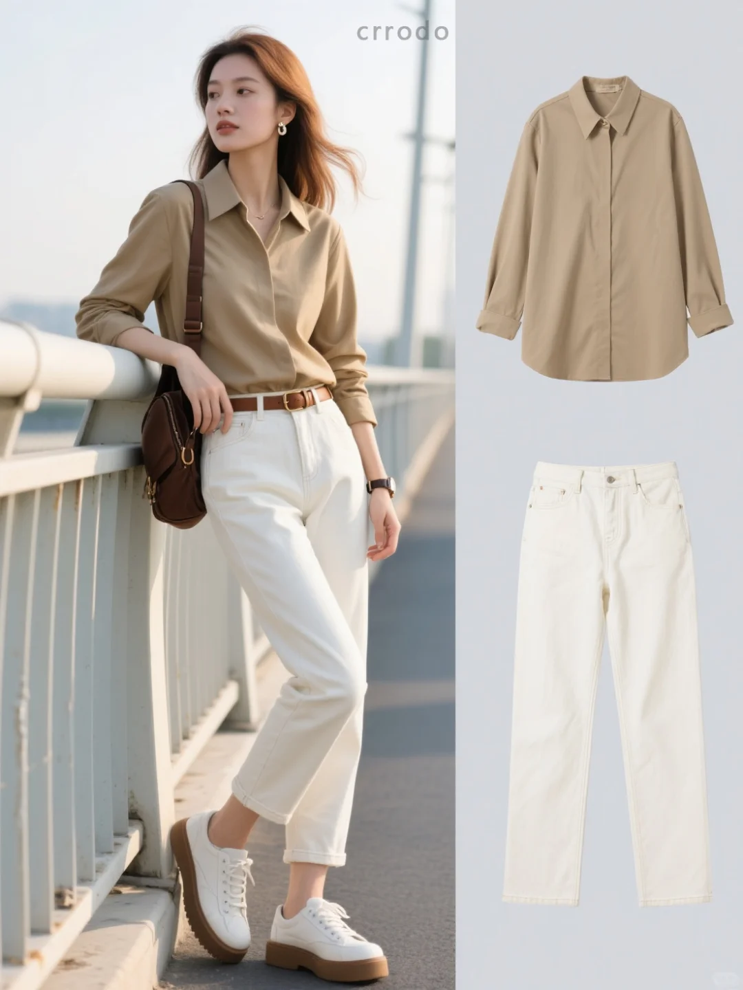 秋日松弛感穿搭|卡其衬衫+白色裤子