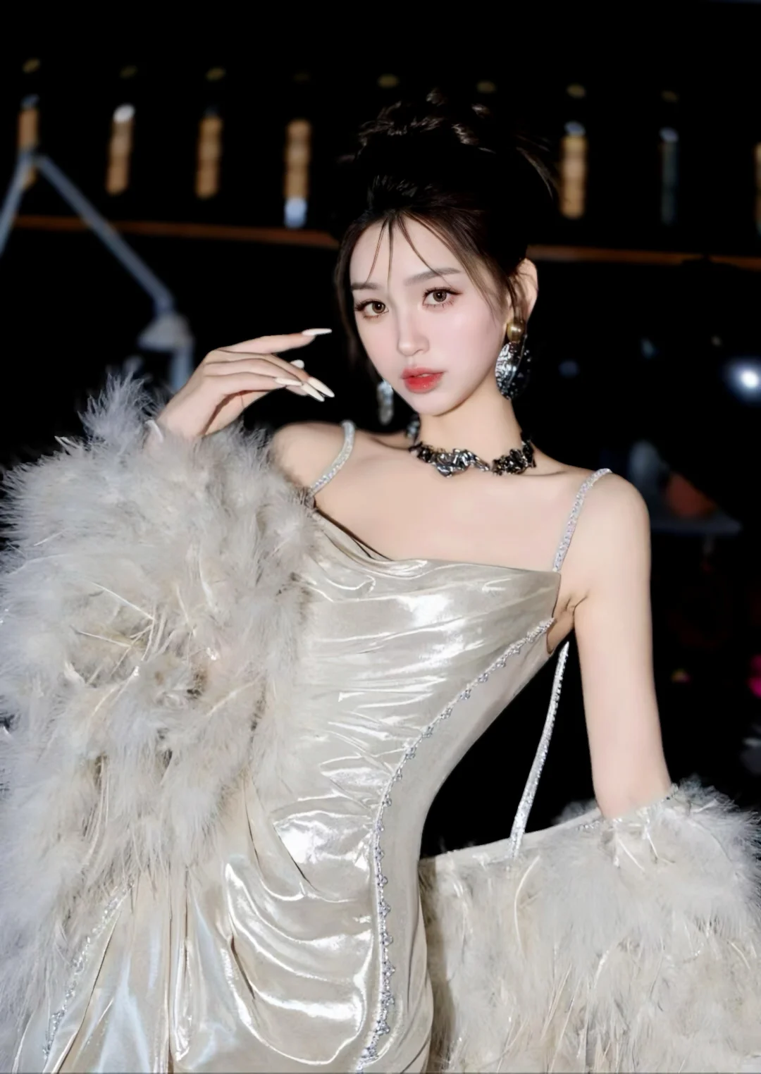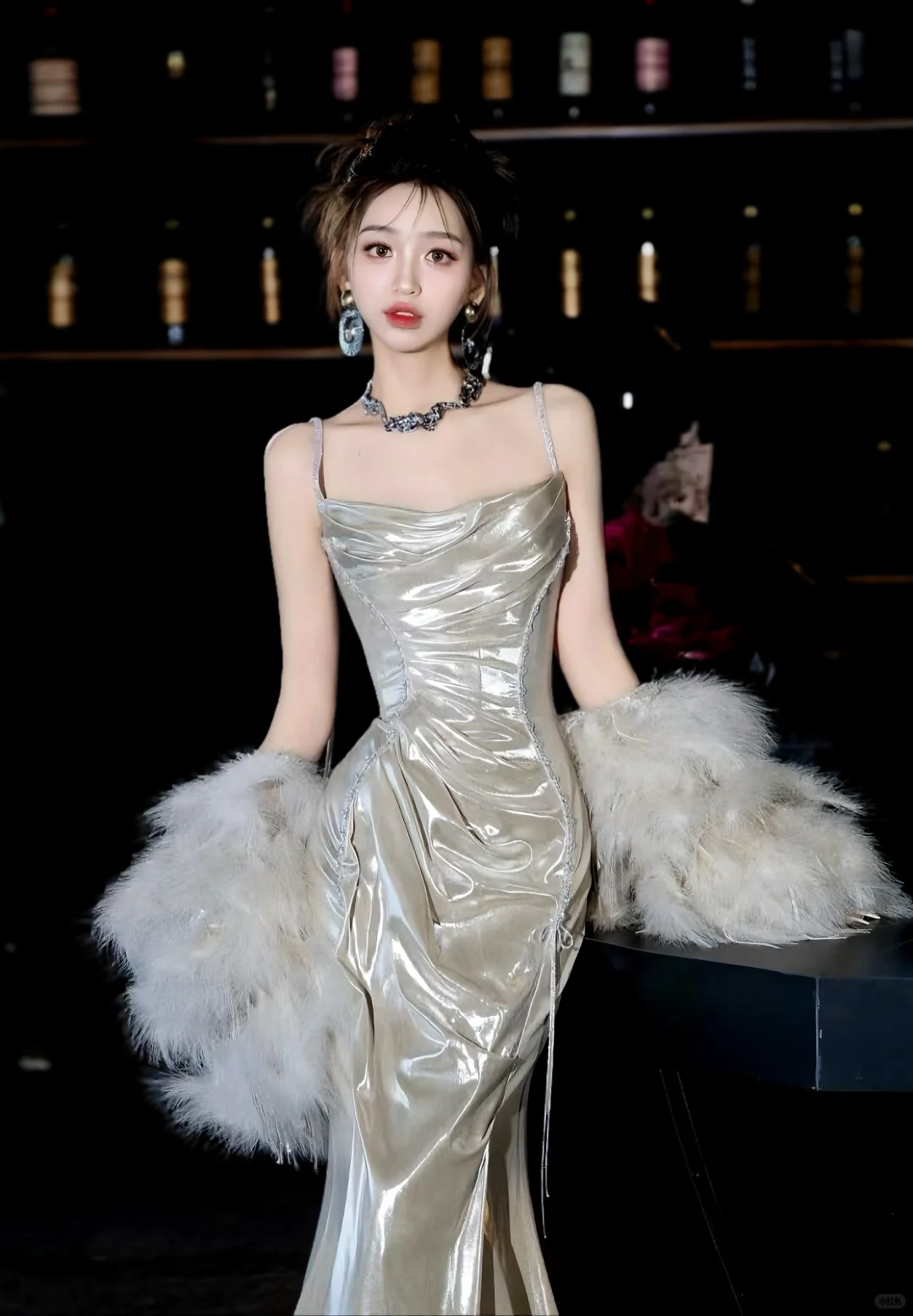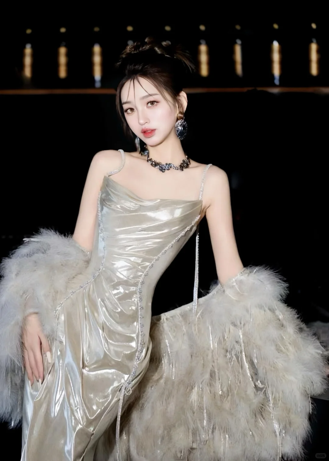图中是一袭银色礼服造型,吊带、修身鱼尾裙设计,搭配毛绒袖套,华丽又有氛围感 。不过仅从现有信息难确定具体女明星同款 ,