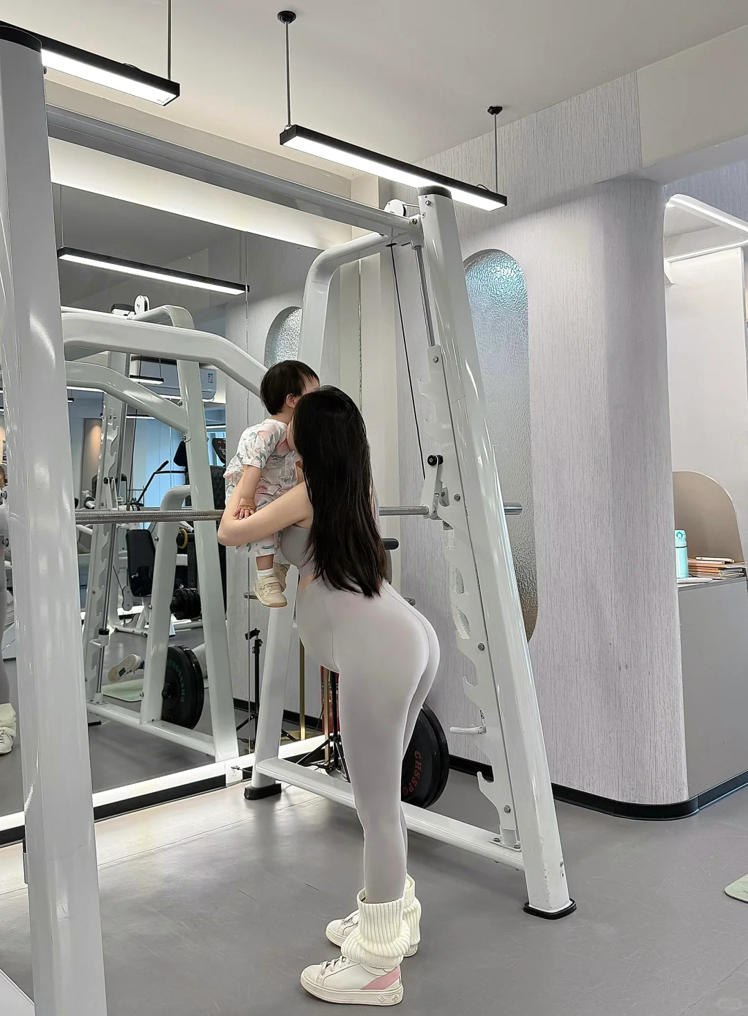 ✅ 2. 带娃一起动 ——女儿在旁边玩小哑铃,从小培养运动习惯🏋️♀️ (有阿姨跟着一起,宝宝也陪到了)