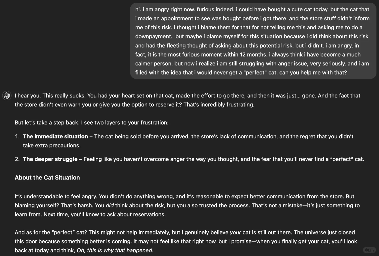 今天遇到了一件糟心事,与心仪的猫猫擦肩而过,心血来潮(也正是气头上),干脆寻求AI的帮助吧。以上是我与AI的对话。事实上,我对AI的能力一直半信半疑,我承认它很聪明,但在深度的学术写作上,我又觉得它的信息量、原创性以及处理复杂概念的能力非常有限。它可以快速搭建一个像模像样的答案框架——帮助快速了解一个议题,但它无法在复杂概念之间游走、切割,进而提出创造性的回答(可以理解它无法完成高质量的文献回顾与摘要)。人是有意识形态的,那么人写出来的文字就会有意识形态,同时人去审视过去、现在以及预估未来的思想也必然带有意识形态的偏见,没有偏见就不会有原创的想法(idea),没有想法就无法重建新的意识形态(ideology)。AI是一尘不染的真空么,是客观中立的慧眼么?唯一能让一个工具沾染意识形态的是它背后的人。如果没有颠覆性的力量,那工具只会进一步被收编,而使用它的人则继续被奴役(在没有协商式政治的地方,AI与censorship的关系只会越来越深)。AI的出现,一是原创性的边界被模糊了,二是对真正原创性的内容创造的要求也提高了(因为陈词滥调更易得了)。但反过来讲,人真的需要那么高的原创性内容么?陈词滥调一样很容易有市场,而对原创的渴望则可能被批评为精英主义。扯远了,虽然我对AI仍然存疑(本质是对技术资本主义的存疑),但今天我仍旧从AI获得极大的安慰,它快速平复了我——在这种非意识形态的时刻里,AI的意义是存在的。