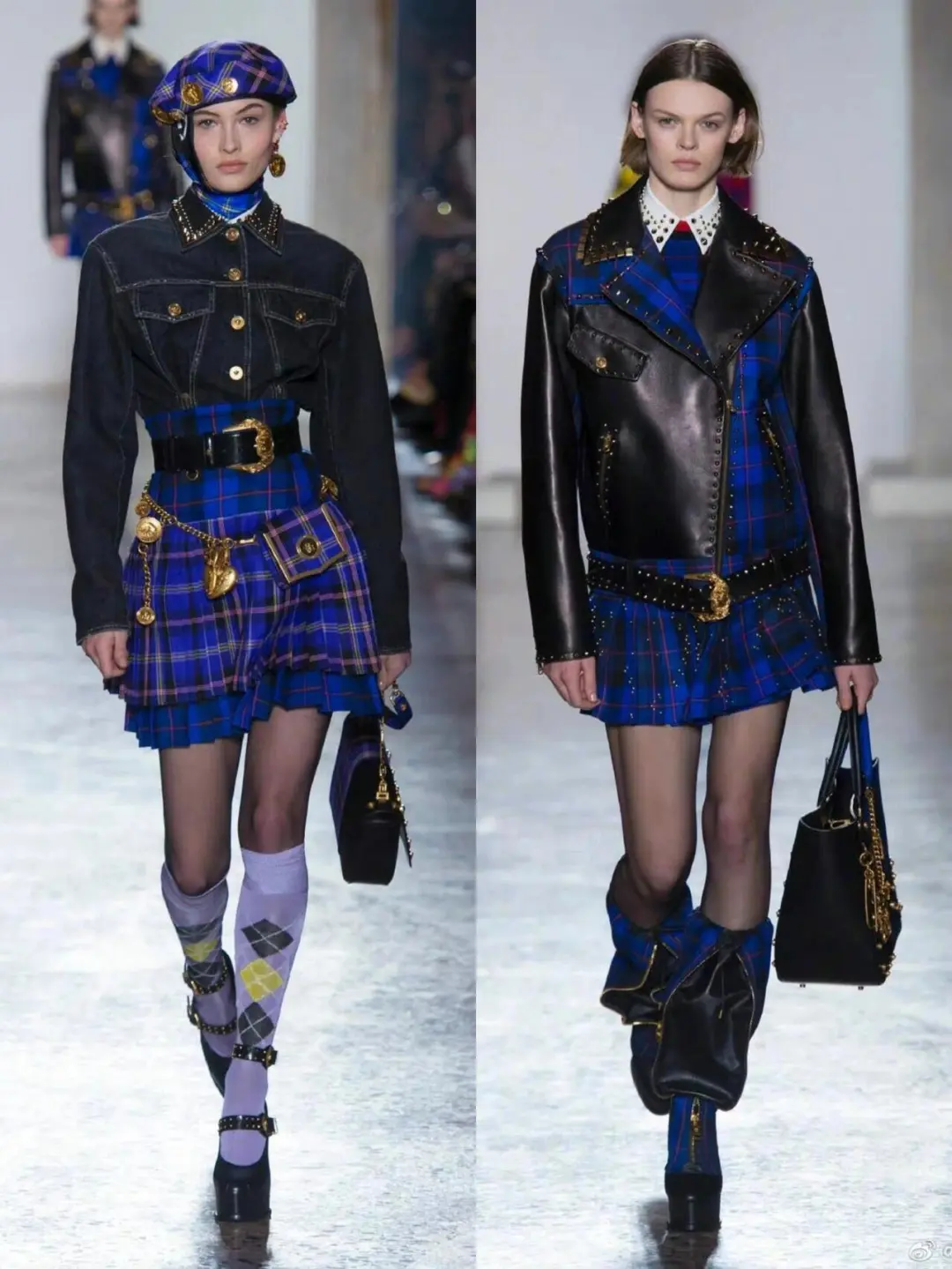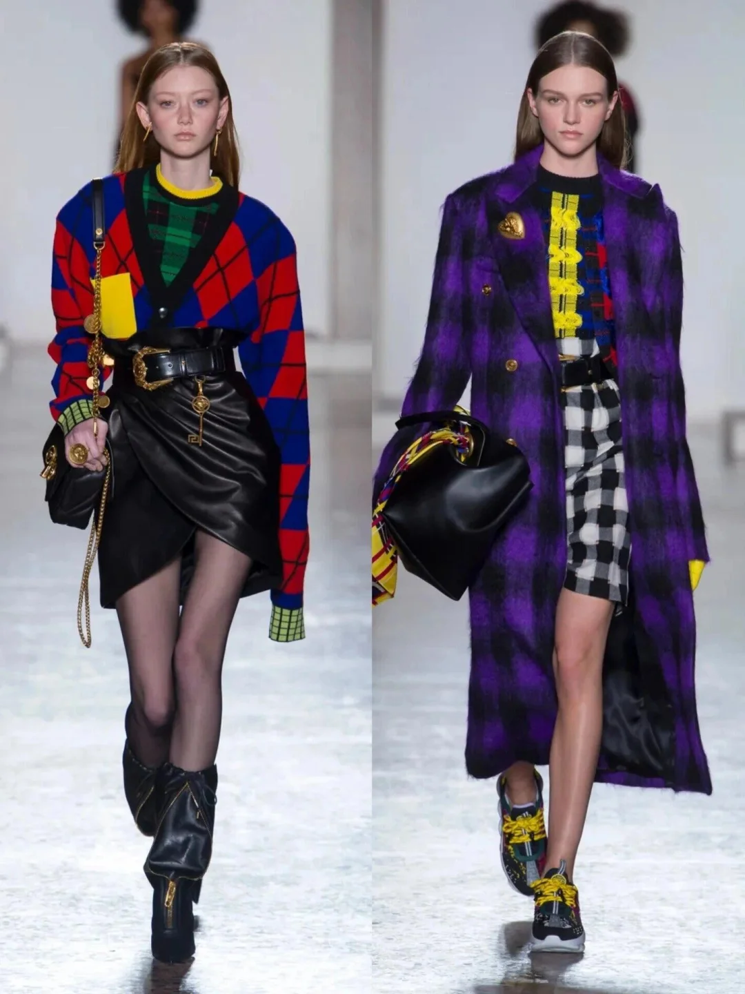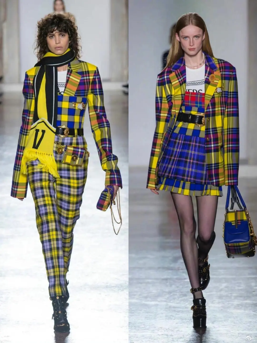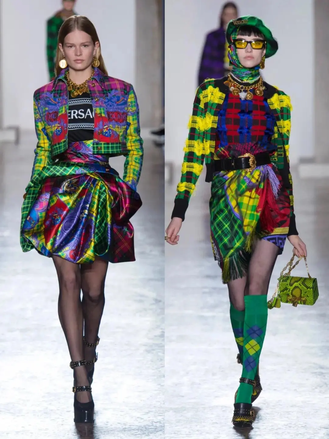 Donatella Versace将摇滚、朋克与足球元素相融合,让经典的格纹元素贯穿始终,色彩明艳大胆,橙、粉、绿等高饱和色调碰撞交织 ,带来强烈视觉冲击。服装剪裁上,修身的西装外套搭配个性鲜明的铆钉、徽章装饰,又与运动风单品碰撞,彰显叛逆不羁。