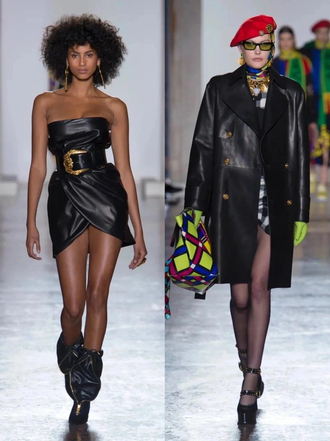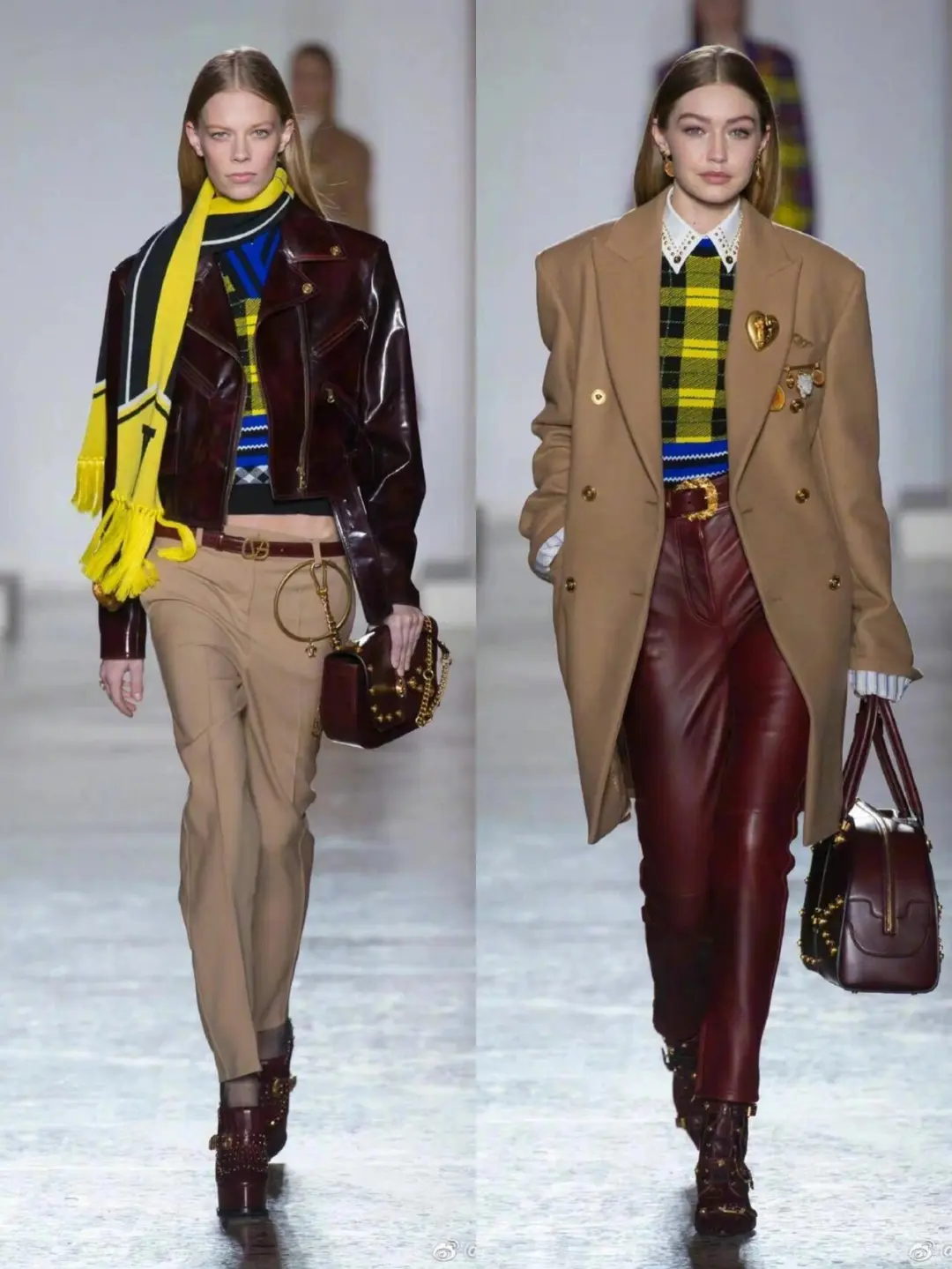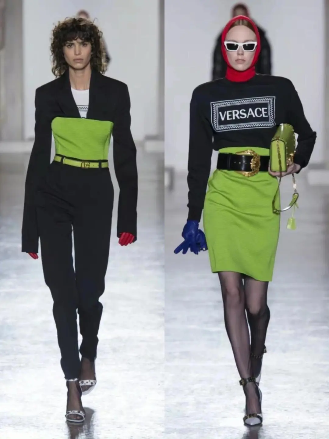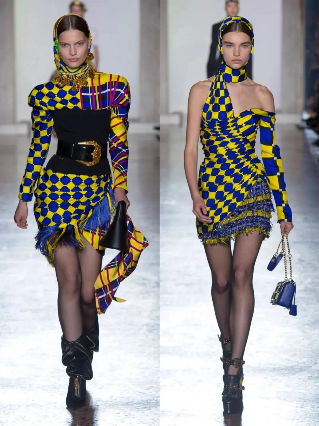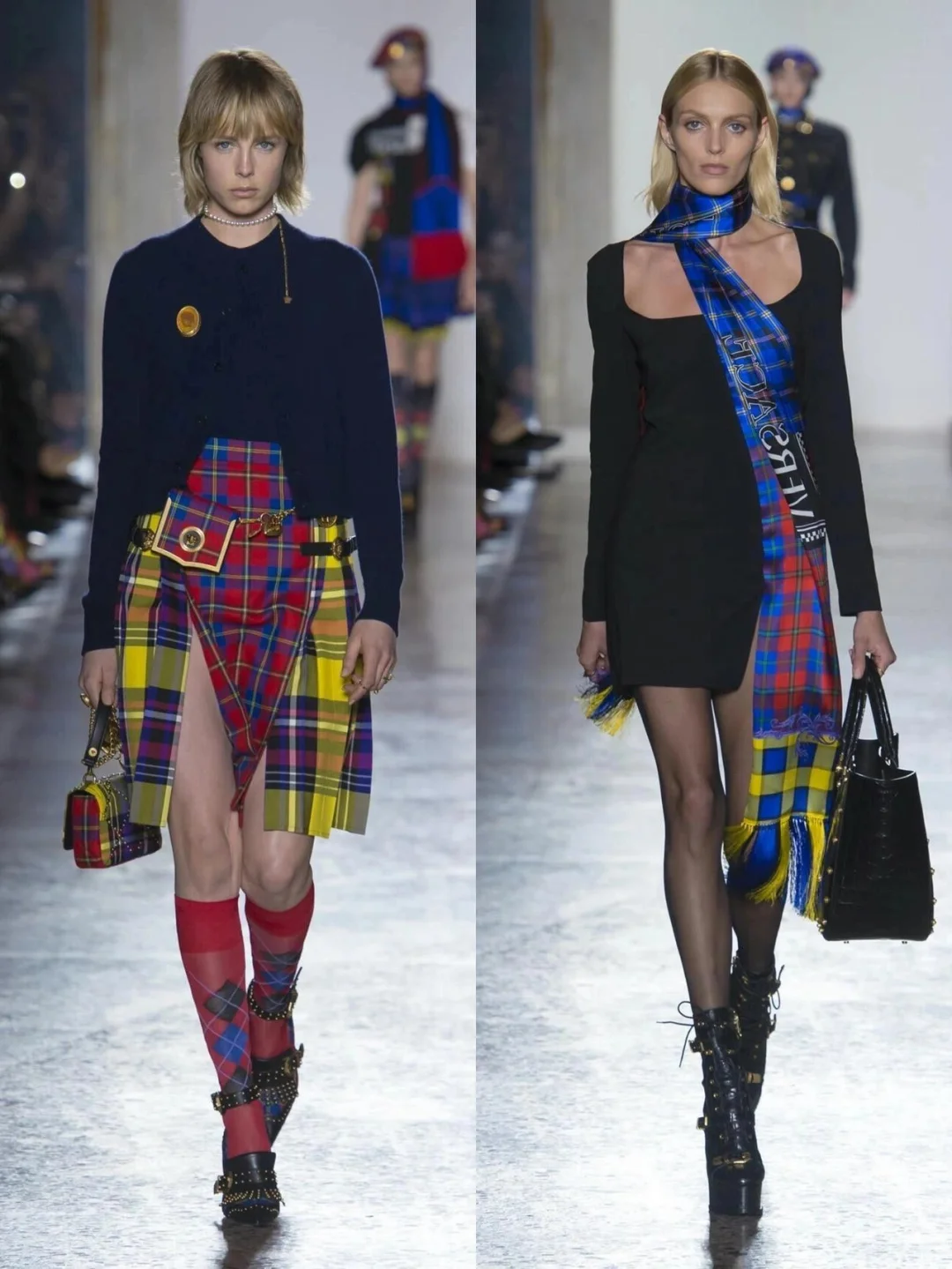Donatella Versace将摇滚、朋克与足球元素相融合,让经典的格纹元素贯穿始终,色彩明艳大胆,橙、粉、绿等高饱和色调碰撞交织 ,带来强烈视觉冲击。服装剪裁上,修身的西装外套搭配个性鲜明的铆钉、徽章装饰,又与运动风单品碰撞,彰显叛逆不羁。