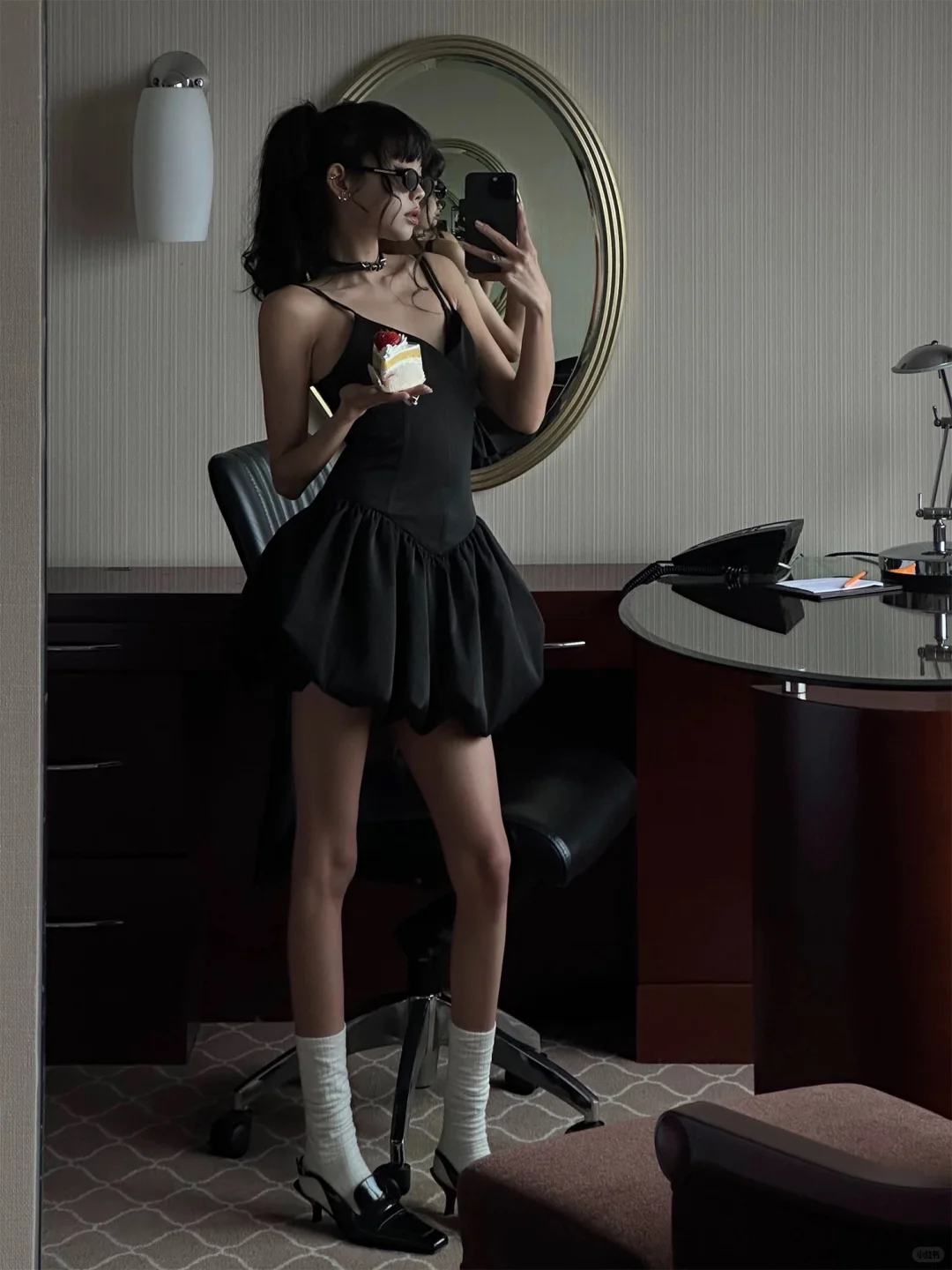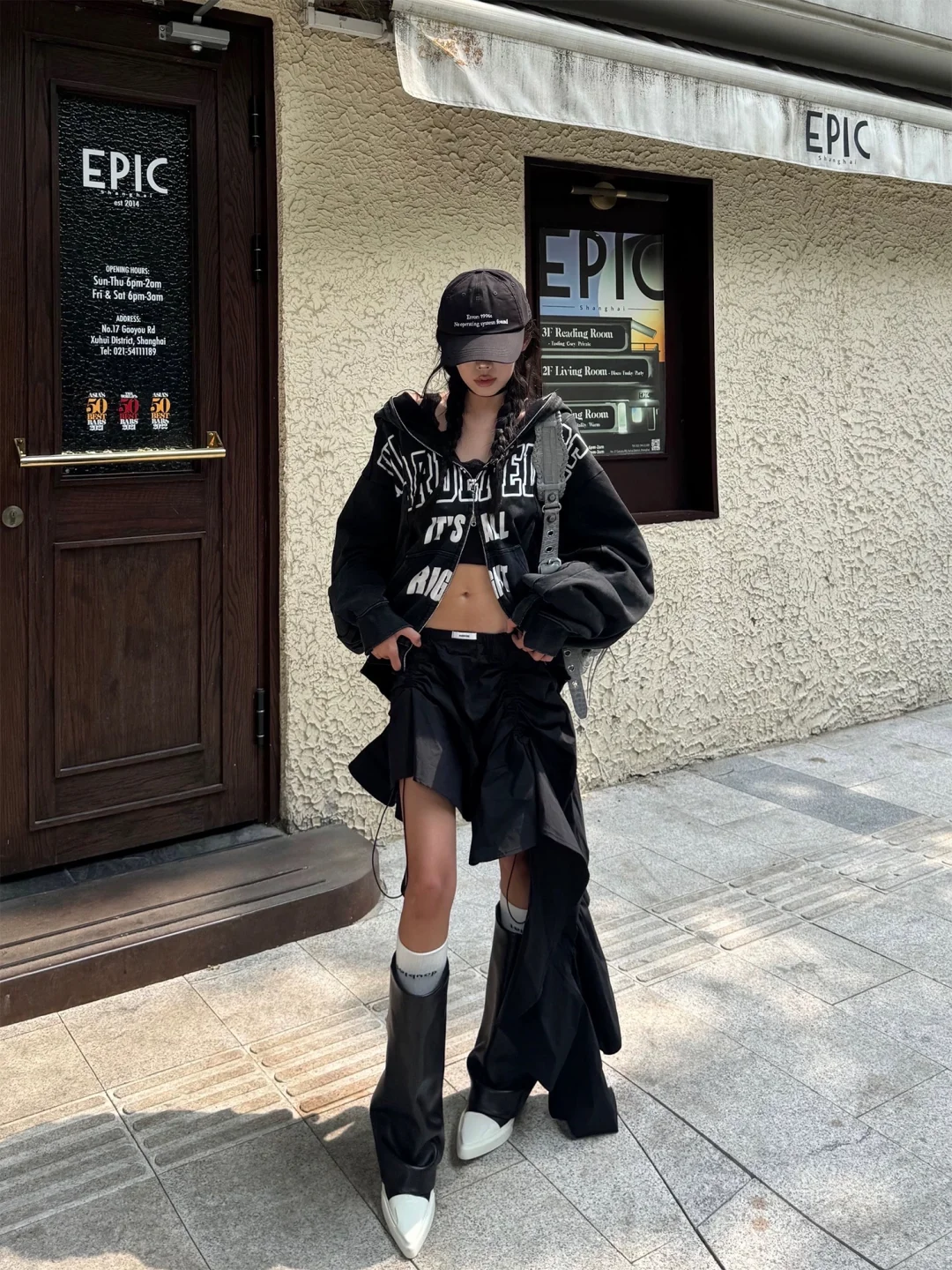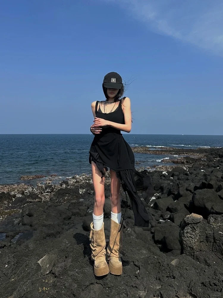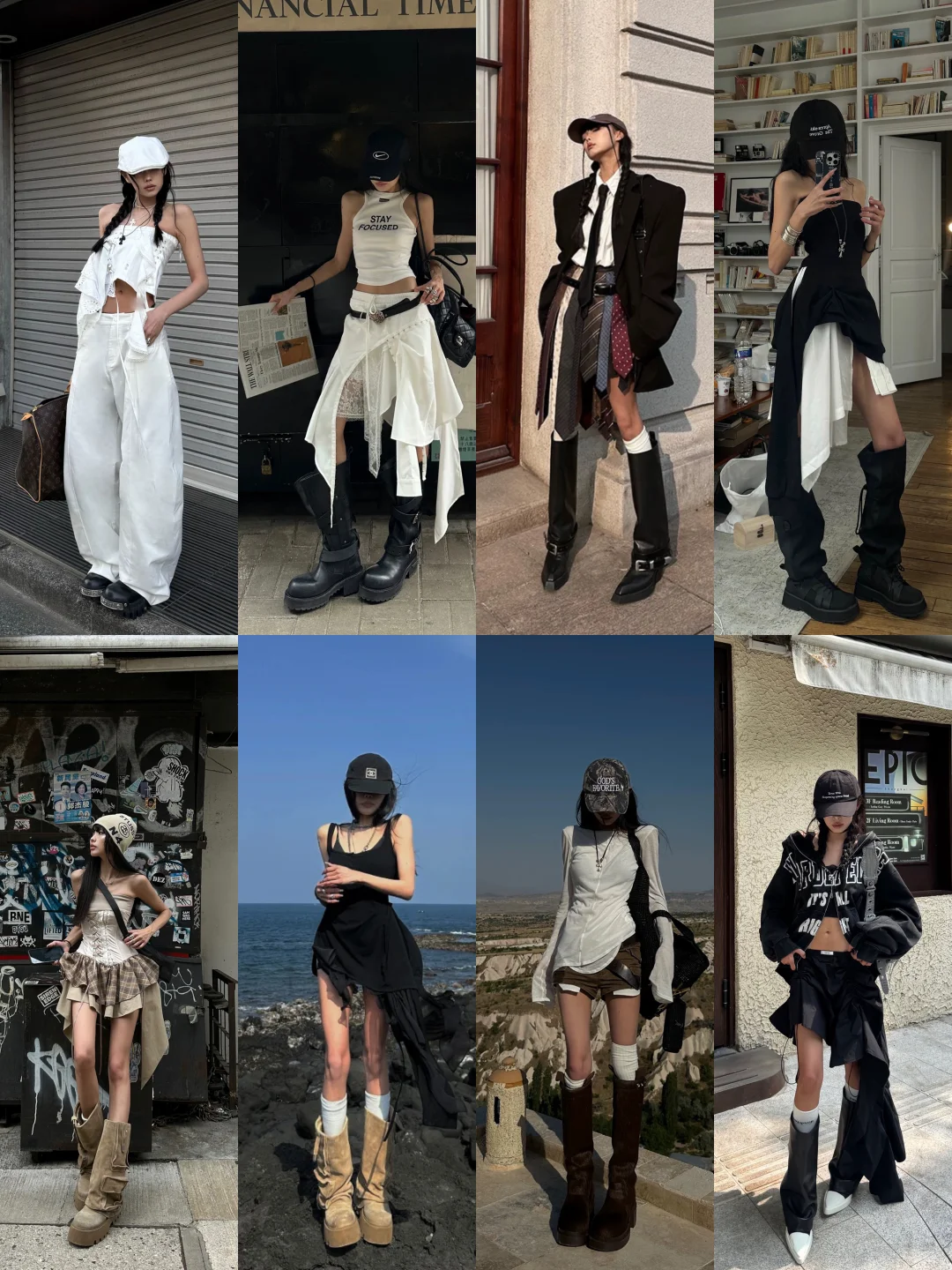 📜酷飒暗黑风:部分穿搭以黑色为主色调,例如黑色的不规则连衣裙搭配黑色长靴,再加上帽子、口罩等配饰,营造出神秘又酷飒的暗黑风格。