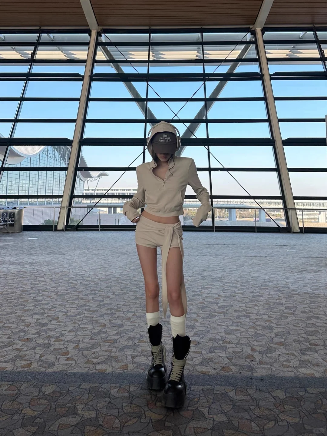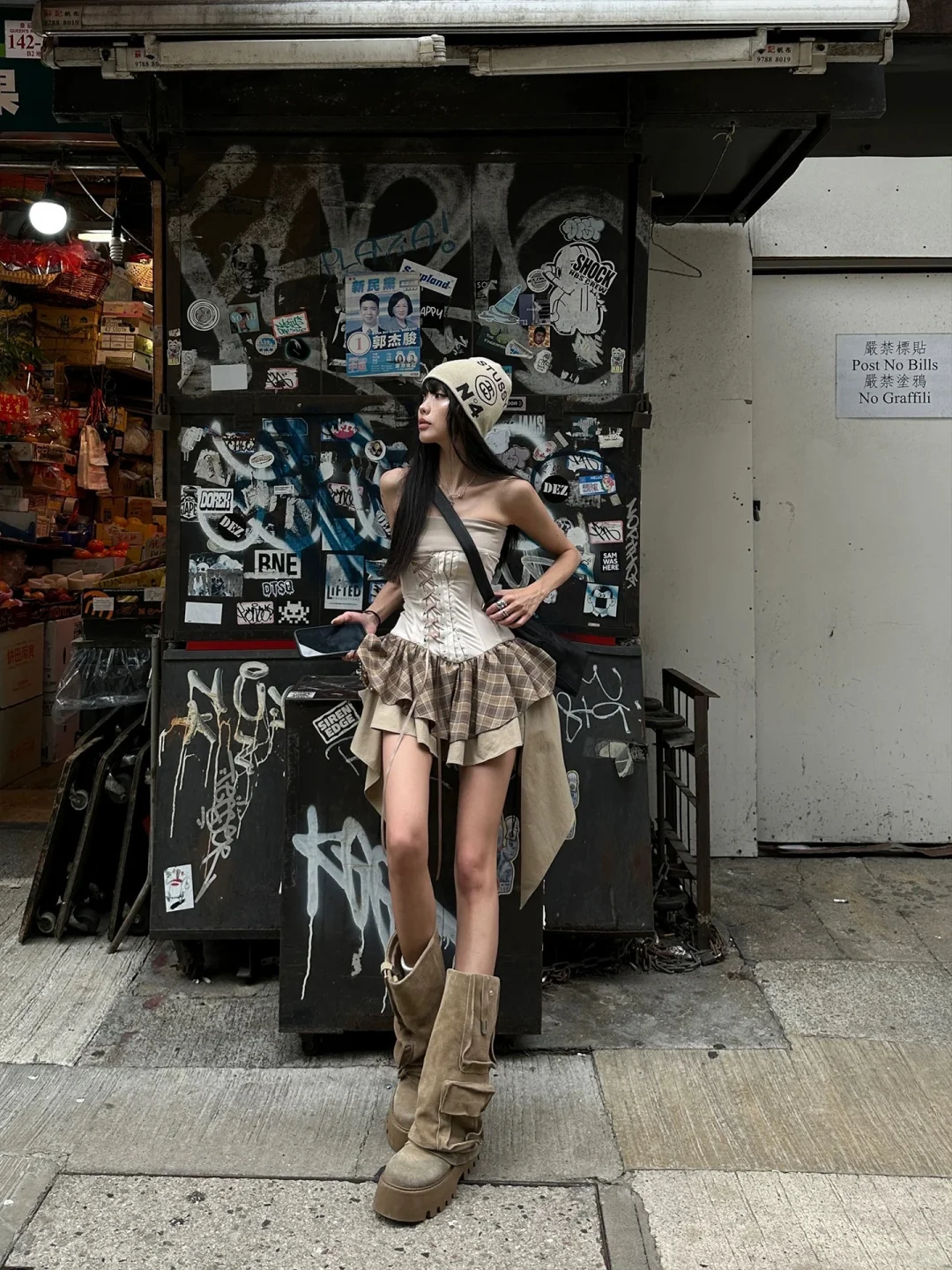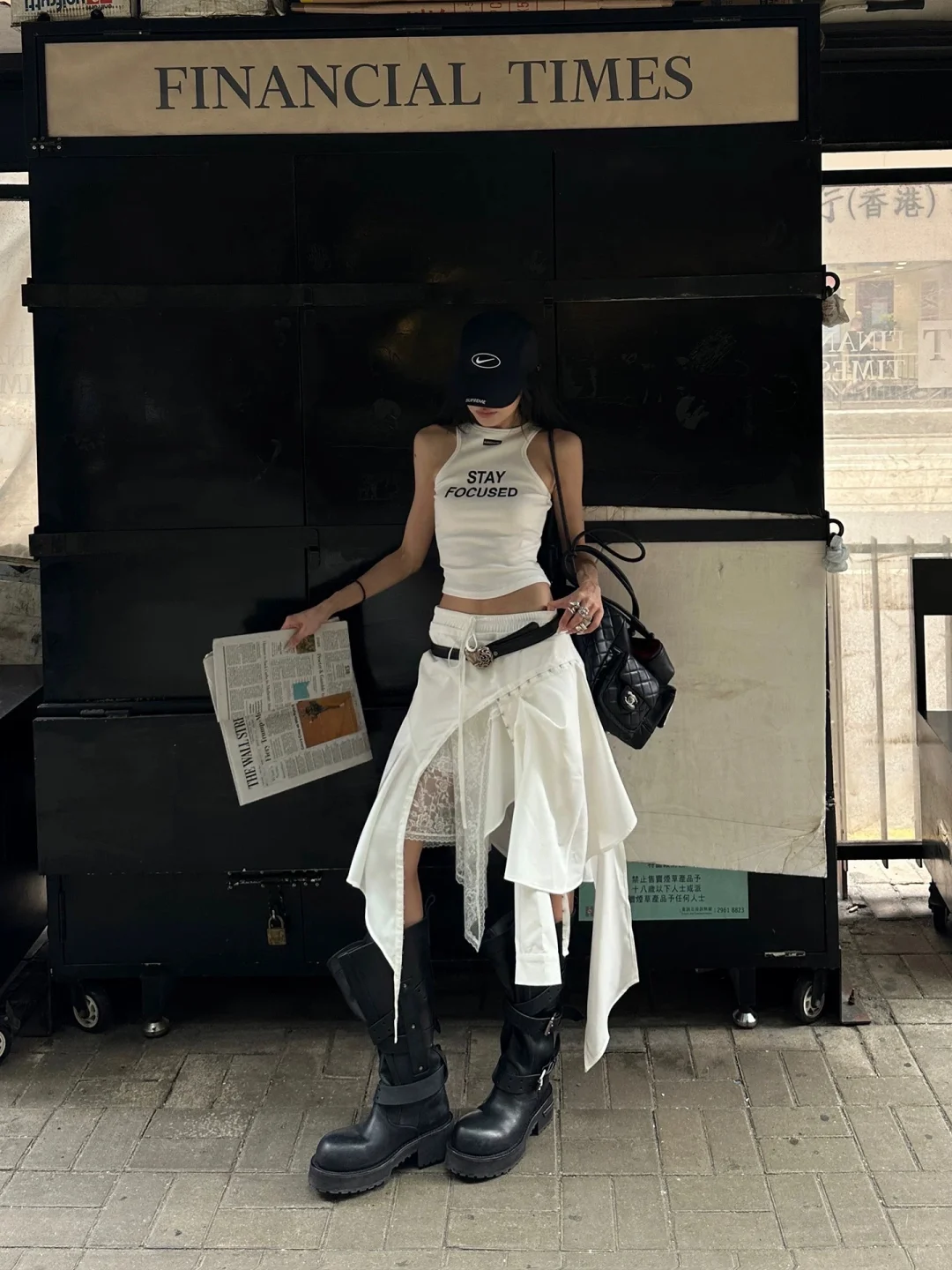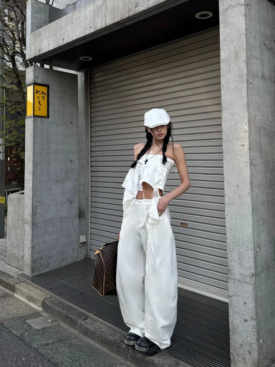 📜Y2K风格与街头风融合:照片中的穿搭大量运用了低腰、露脐、不规则剪裁等Y2K风格元素,比如低腰的白色阔腿裤搭配露脐抹胸,以及不规则剪裁的裙摆等 。同时,棒球帽、印花帽衫等单品又增添了浓厚的街头感。