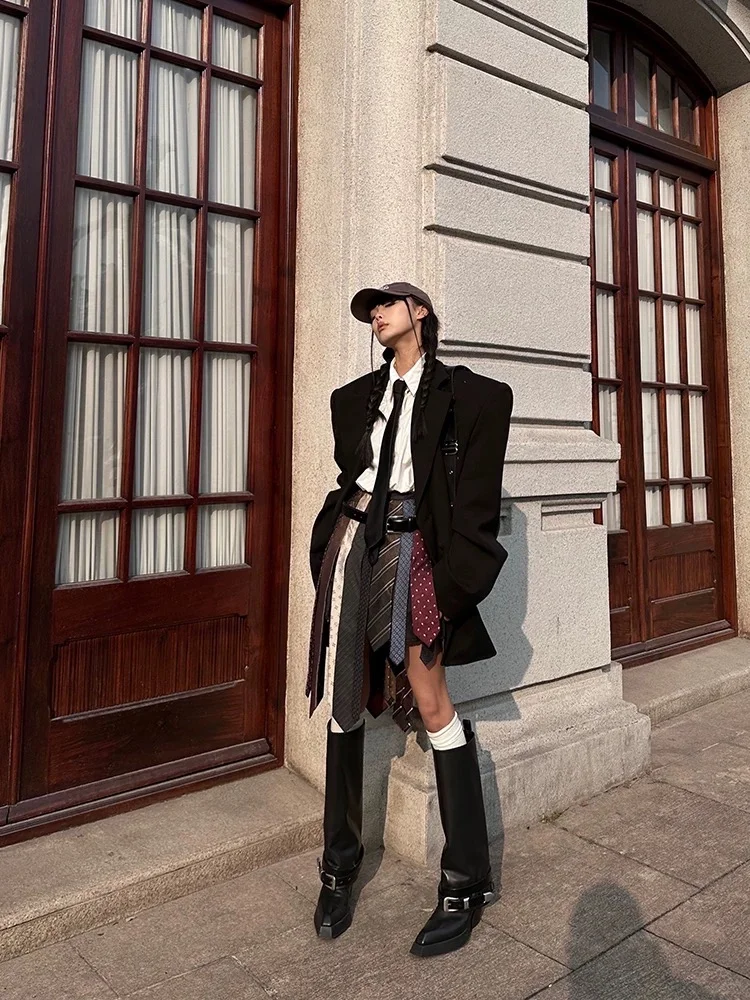 📜中性混搭风:像用宽大的西装外套搭配领带、短裤和长靴,打破了传统性别穿搭界限,展现出随性又个性的中性混搭风。