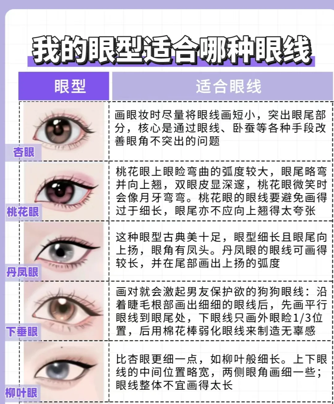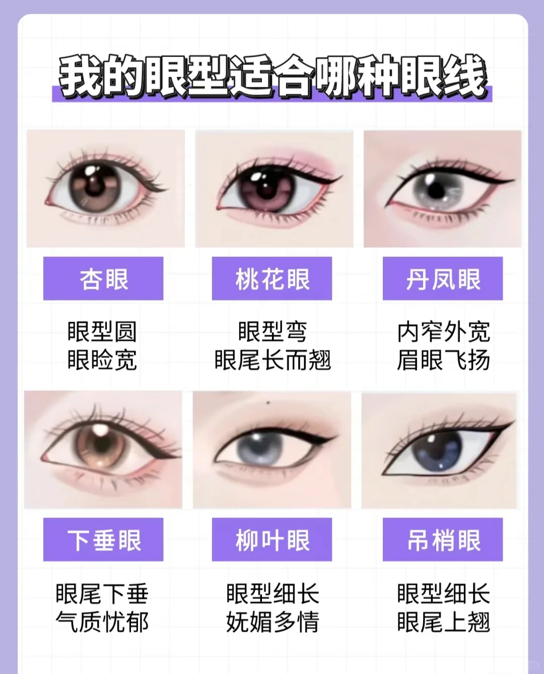 吊眼。上扬的眼型,适合下垂型的眼线,使眼睛看起来更大更有亲和力。