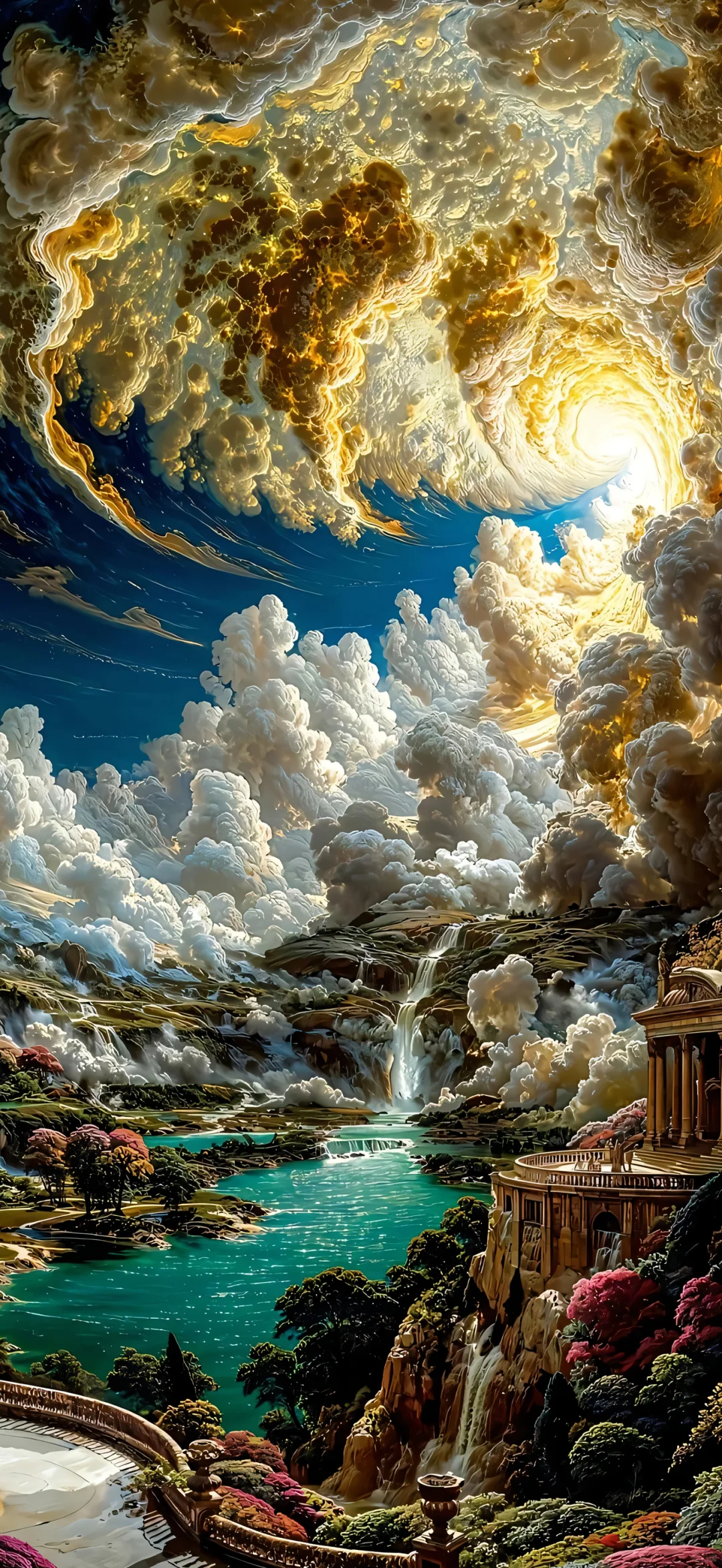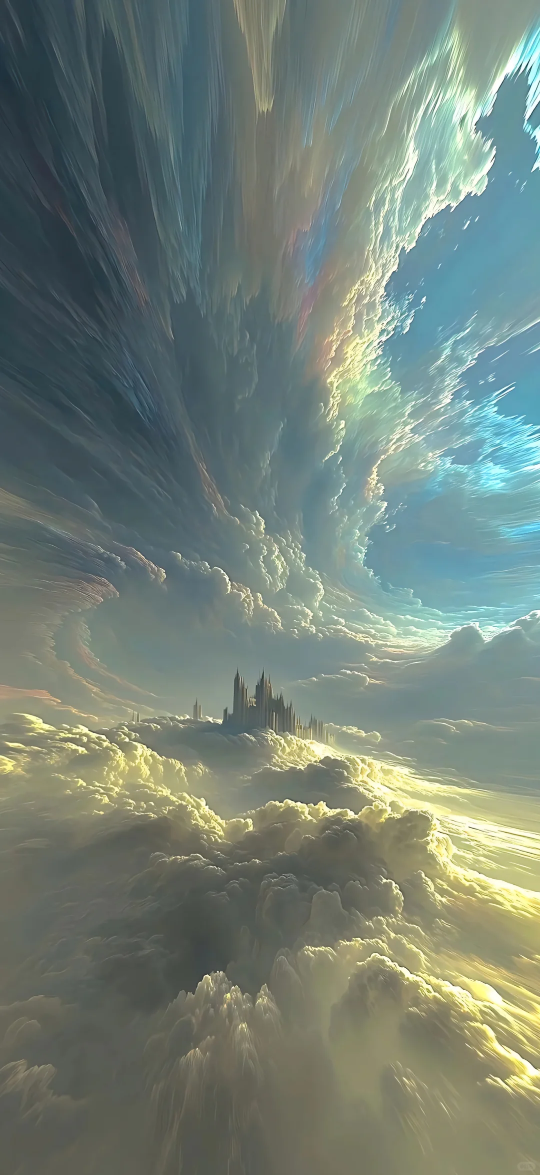 金黄与纯白的云团在天空翻涌,像流动的油画,又像宇宙星云的缩影!光线穿透的瞬间,感觉下一秒就有神明要从云里走出来…