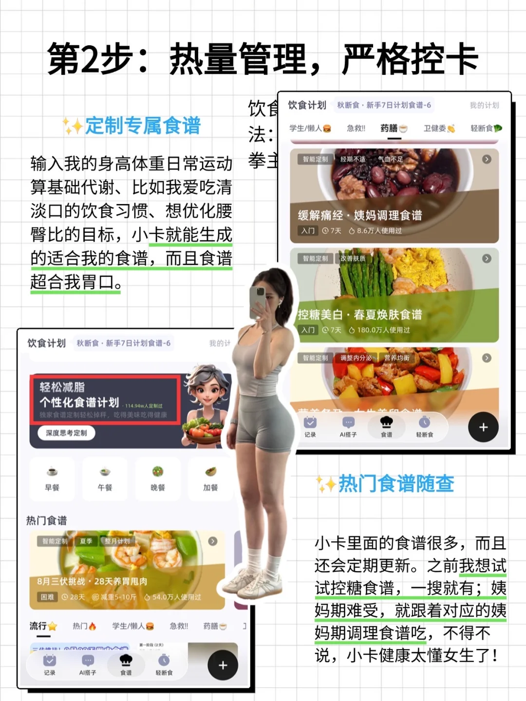✨定制专属食谱:输入我的身高体重日常运动算基础代谢、比如我爱吃清淡口的饮食习惯、想优化腰臀比的目标,小卡就能生成的适合我的食谱,而且食谱超合我胃口。