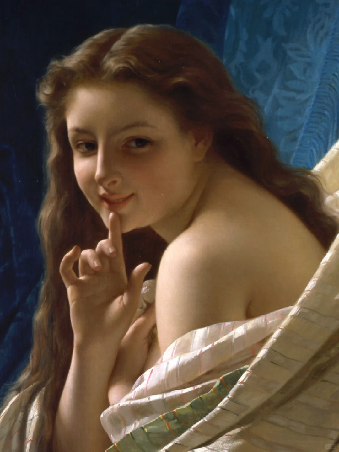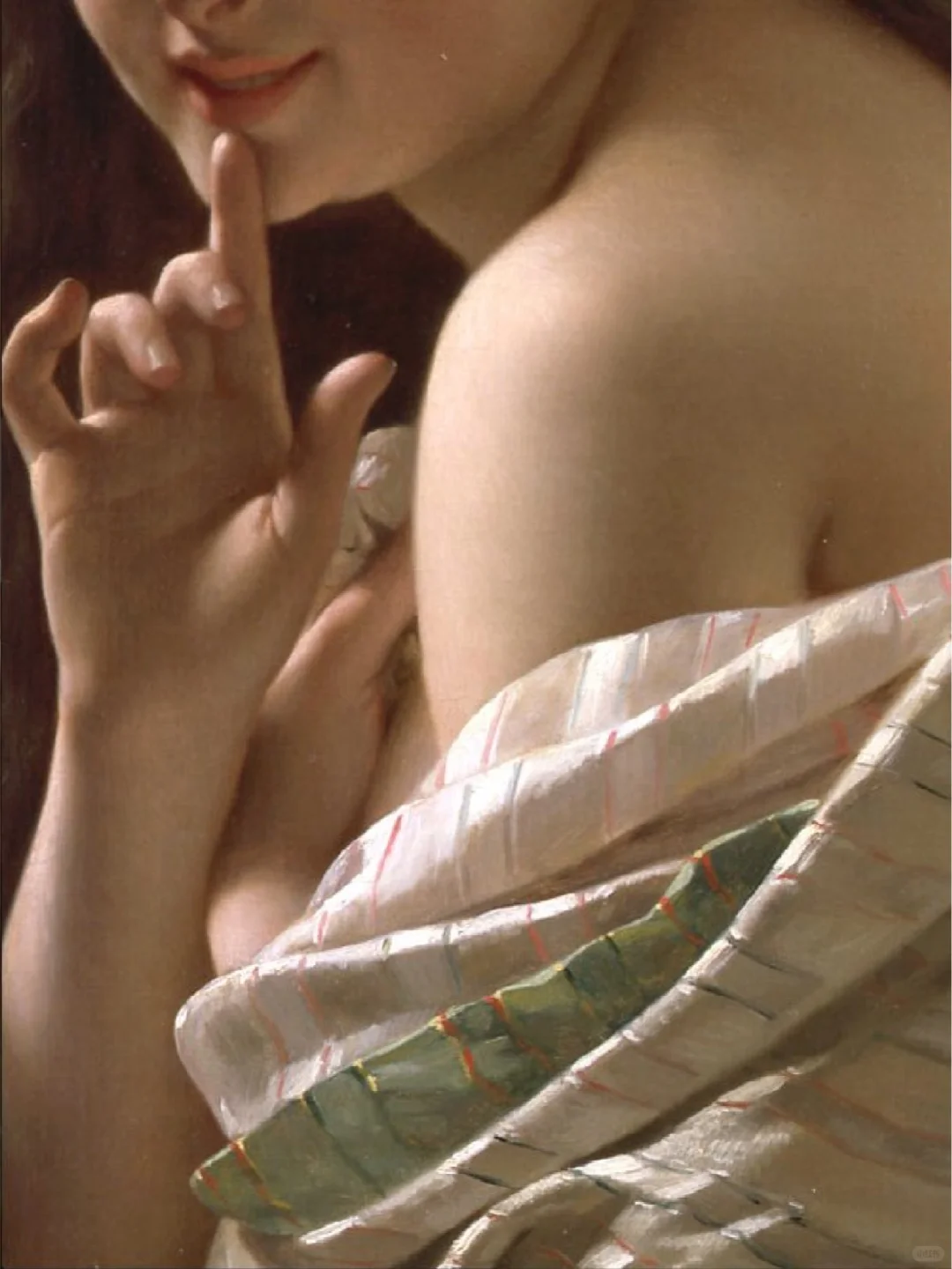 -这幅作品《年轻女子肖像》“Portrait of a Young Woman”是他于1869年创作的油画,描绘了一位迷人的青春少女。她一只手挽着披在身体上的精致布料,另一只手伸出食指放在唇下,转头对着观众微笑。