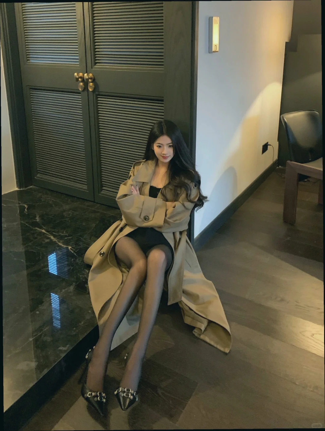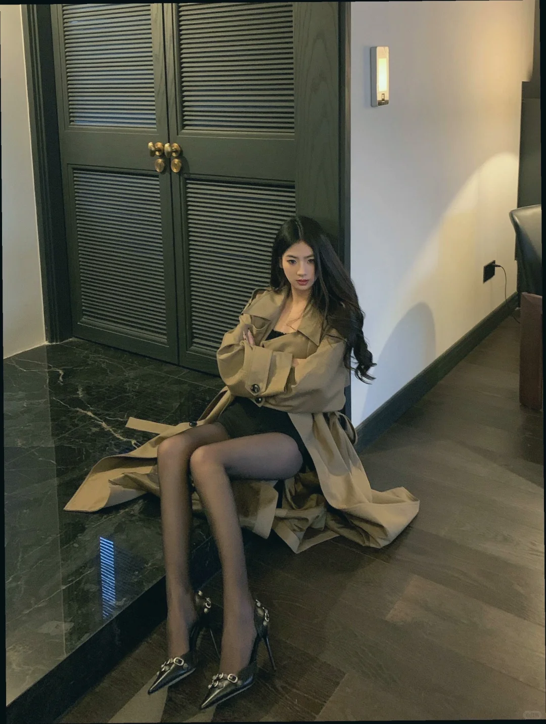 • 纯欲御姐风:内搭黑色吊带裙+黑丝+铆钉高跟鞋,风衣半披,约会/蹦迪都能slay全场,被要链接到社恐的程度!