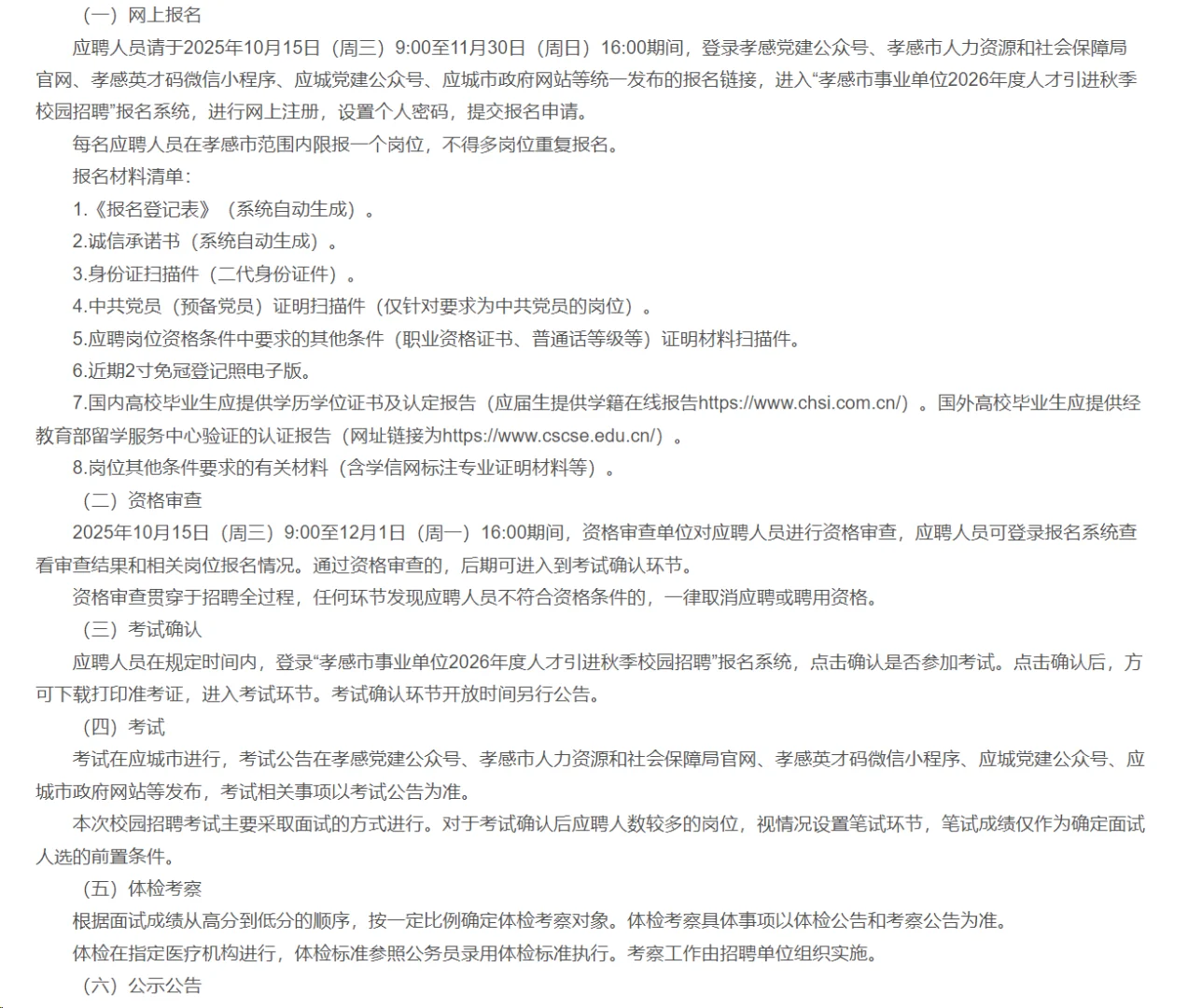 3.报名方式:网上报名,登录孝感党建公众号、孝感市人力资源和社会保障局官网、孝感英才码微信小程序等统一发布的报名链接,进入“孝感市事业单位2026年度人才引进秋季校园招聘”报名系统,进行网上注册,设置个人密码,提交报名申请。