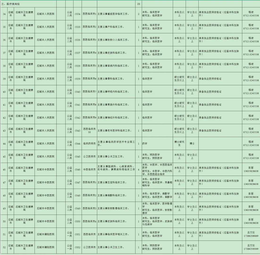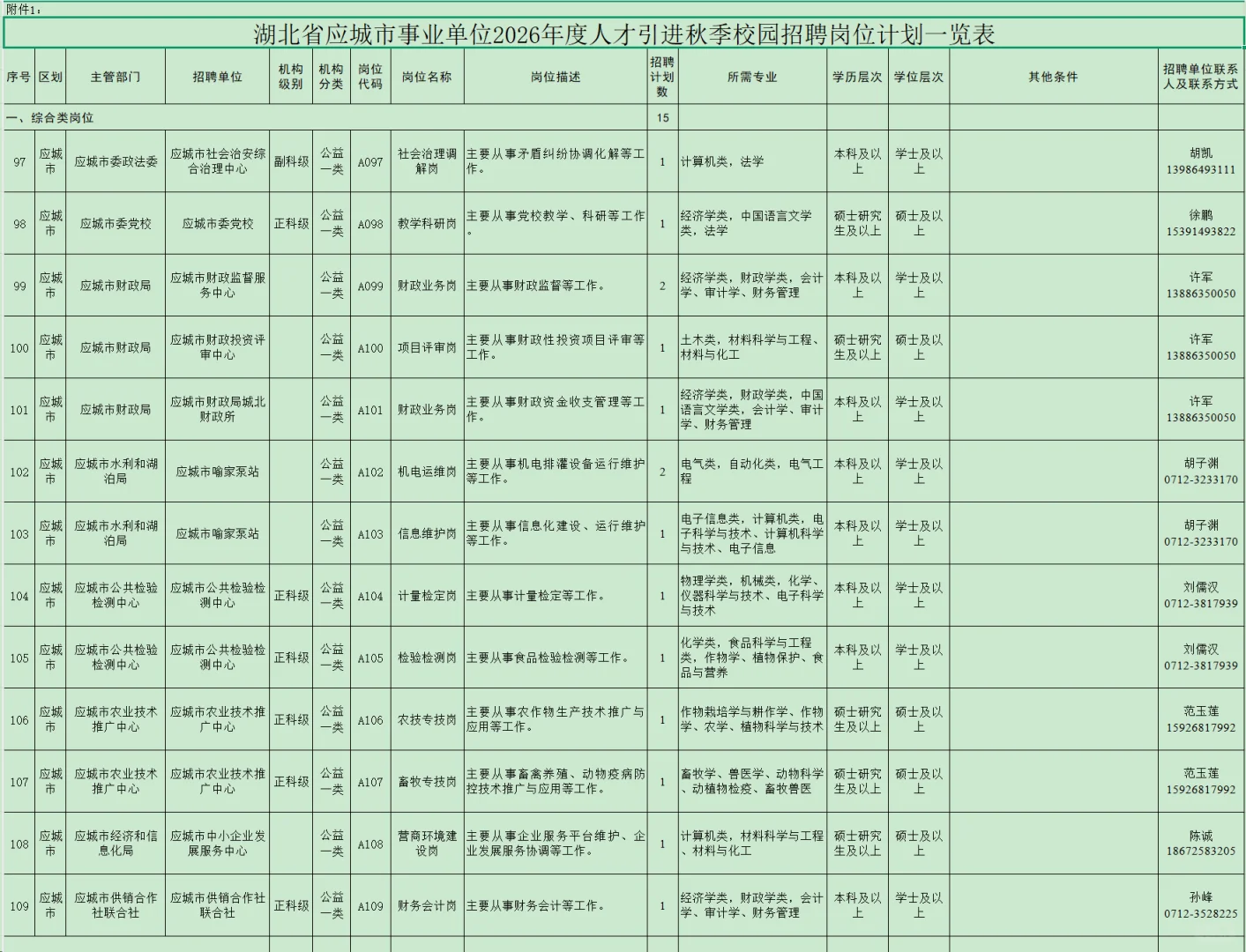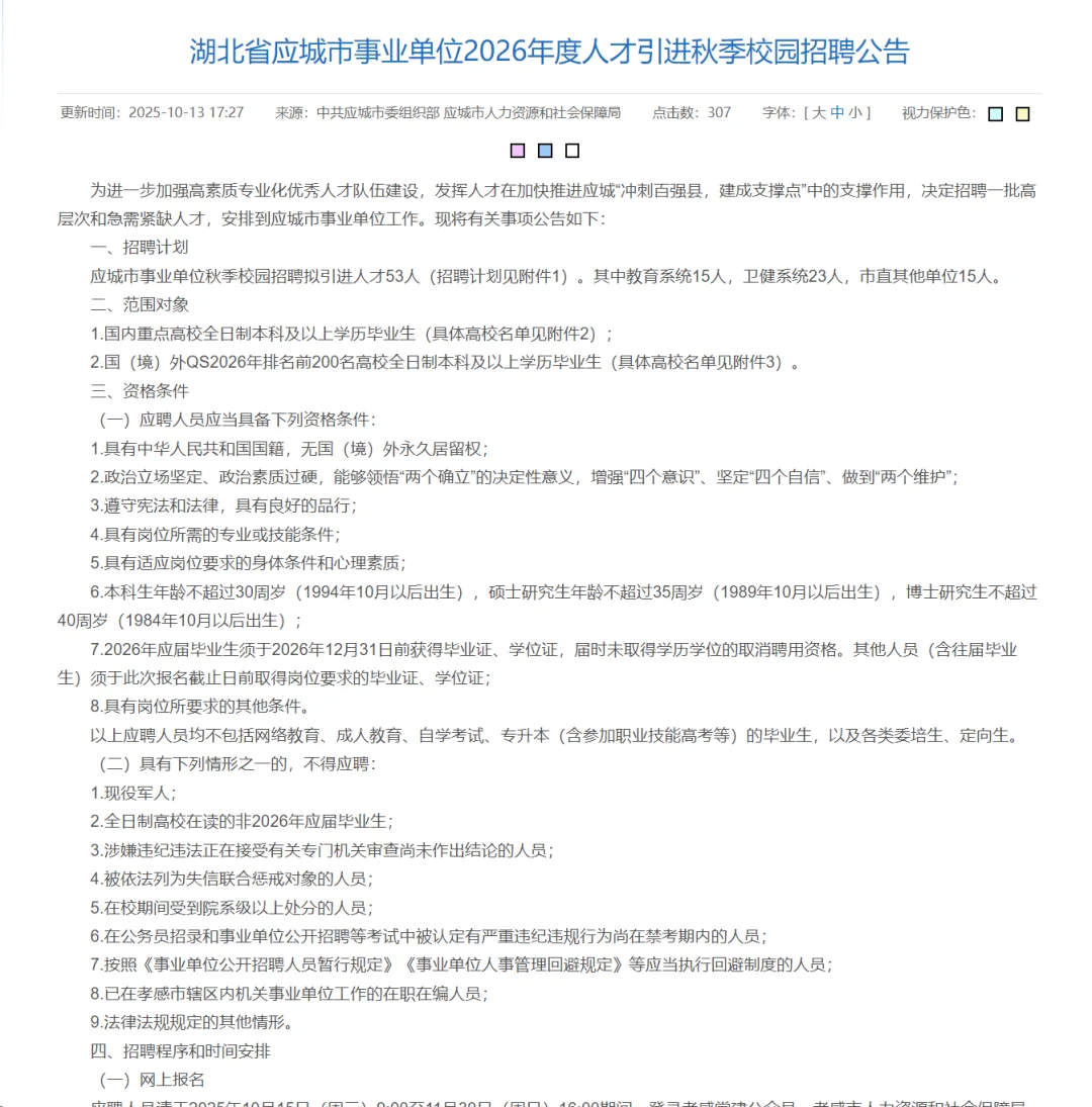 孝感市应城市事业单位2026年度人才引进秋季校园招聘公告【53名】