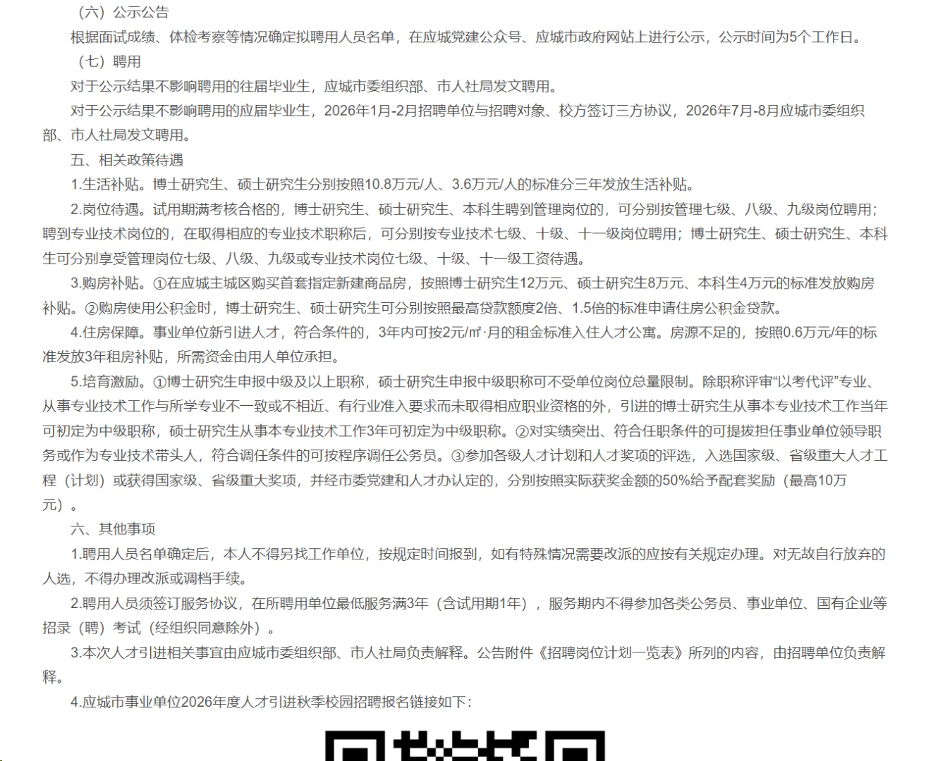 6.聘用:①对于公示结果不影响聘用的往届毕业生,孝感市委人才办、市人社局发文聘用。②对于公示结果不影响聘用的应届毕业生,2026年1月-2月招聘单位与招聘对象、校方签订三方协议,2026年7月-8月孝感市委人才办、市人社局发文聘用。聘用人员须签订服务协议,在所聘用单位最低服务满3年(含试用期1年),服务期内不得参加各类公务员、事业单位、国有企业等招录(聘)考试(经组织同意除外)。事业单位引进的人才纳入事业编制管理,聘用人员须签订服务协议,在所聘用单位最低服务满3年,服务期内不得参加各类公务员、事业单位、国有企业等招录(聘)考试(经组织同意除外)。