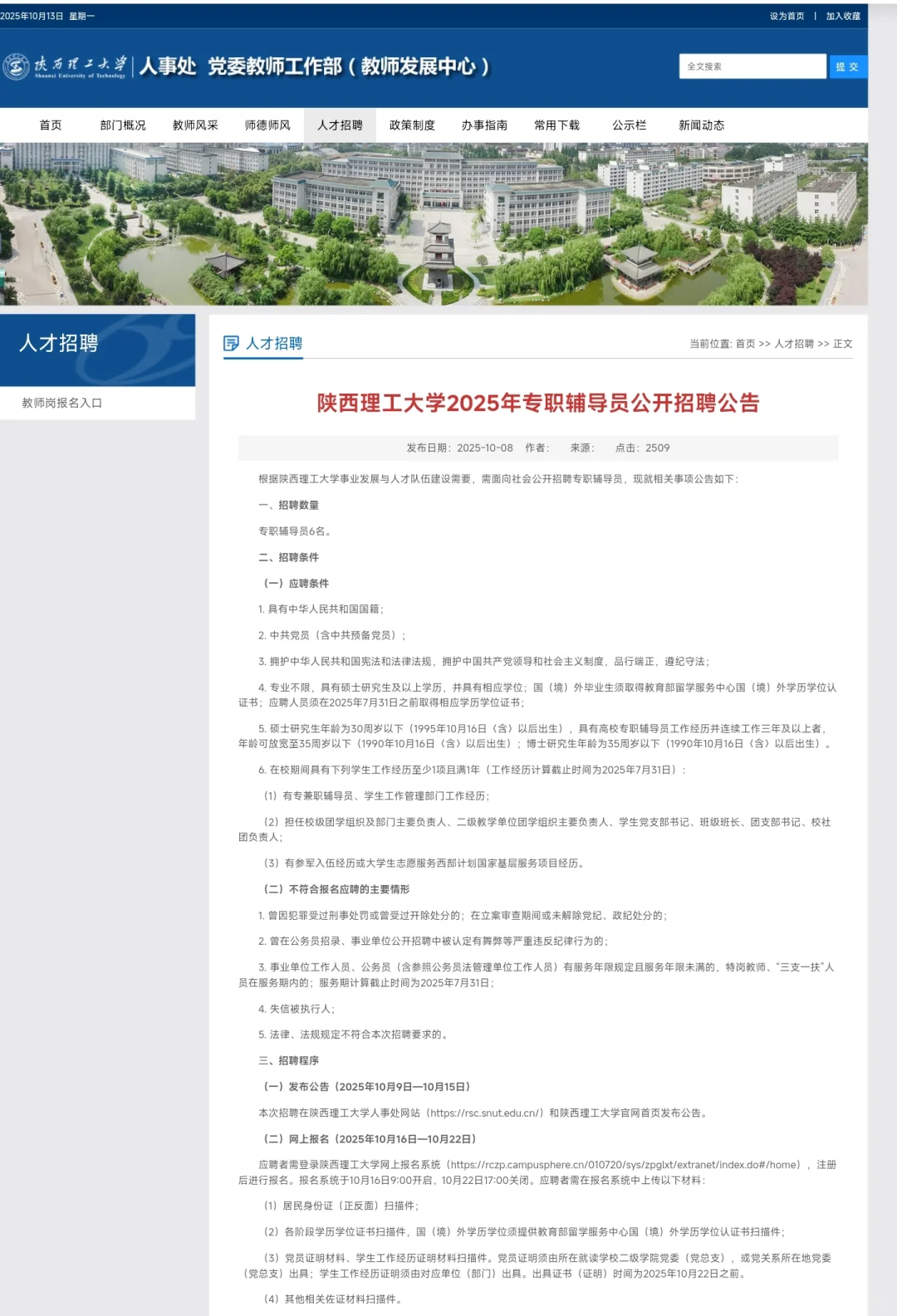 应聘者需登录陕西理工大学网上报名系统,注册后进行报名。报名系统于10月16日9:00开启,10月22日17:00关闭。应聘者需在报名系统中上传以下材料:
