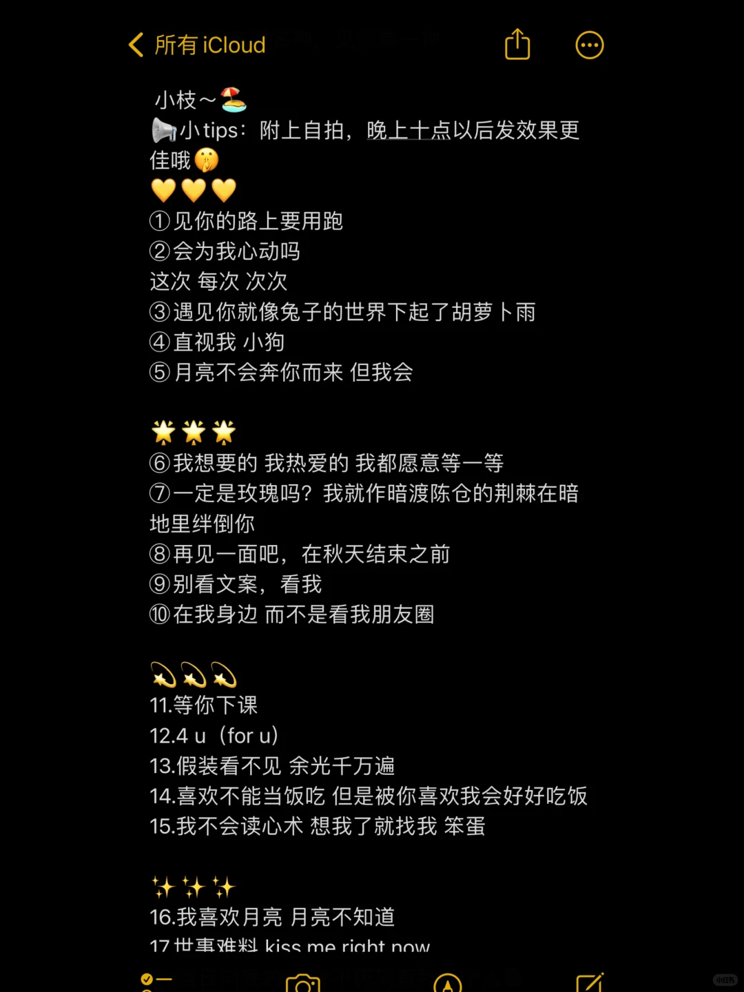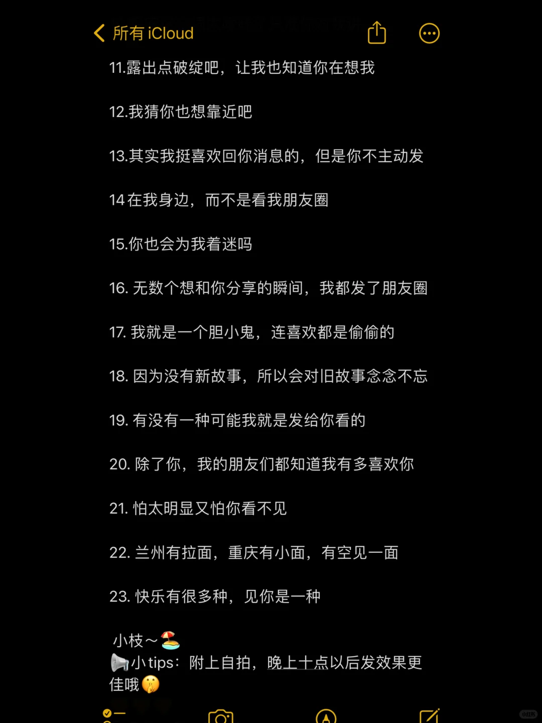 📢小tips:附上自拍,晚上十点以后发效果更佳哦🤫 💛💛💛 ①见你的路上要用跑 ②会为我心动吗 这次 每次 次次 ③遇见你就像兔子的世界下起了胡萝卜雨 ④直视我 小狗 ⑤月亮不会奔你而来 但我会 🌟🌟🌟 ⑥我想要的 我热爱的 我都愿意等一等 ⑦一定是玫瑰吗?我就作暗渡陈仓的荆棘在暗地里绊倒你 ⑧再见一面吧,在秋天结束之前 ⑨别看文案,看我 ⑩在我身边 而不是看我朋友圈 💫💫💫 11.等你下课 12.4 u(for u) 13.假装看不见 余光千万遍 14.喜欢不能当饭吃 但是被你喜欢我会好好吃饭 15.我不会读心术 想我了就找我 笨蛋 ✨✨✨ 16.我喜欢月亮 月亮不知道 17.世事难料 kiss me right now 18.落日向晚的浪漫 不该只有我一个人看 19.怕太显眼又怕你看不见 20.要用什么文案才能引起crush的兴趣