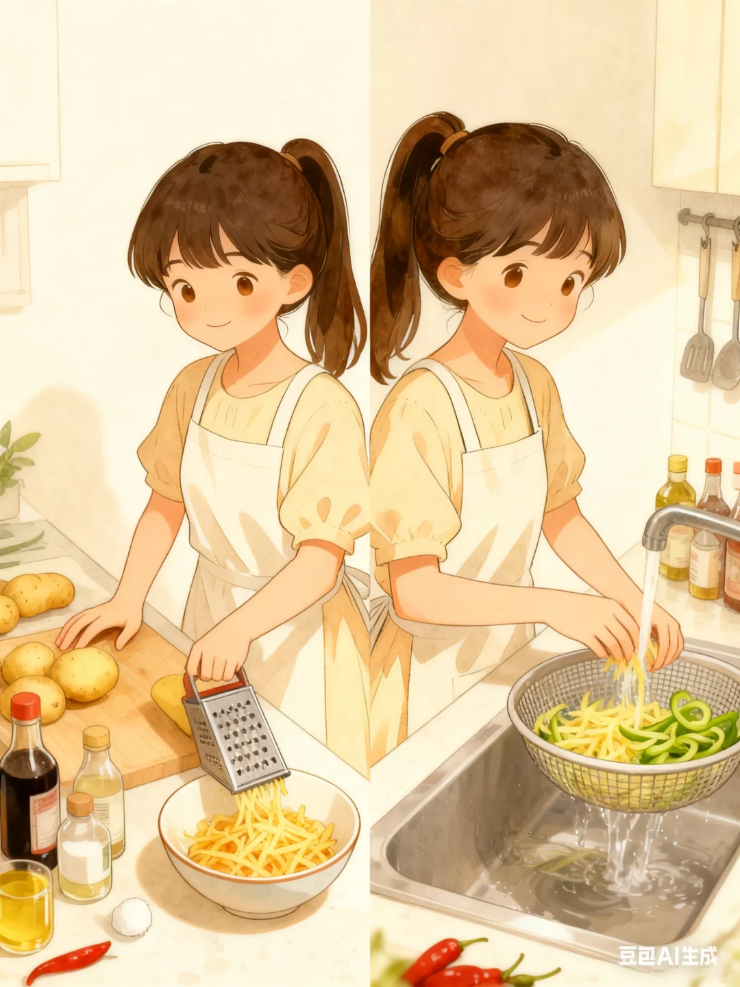 1.土豆切丝(如果大家是个颜控可以尝试用那种专门工具擦丝),切完用水冲洗一下,洗去土豆表面淀粉,防止炒时粘连,沥干备用。青椒也切丝备用。