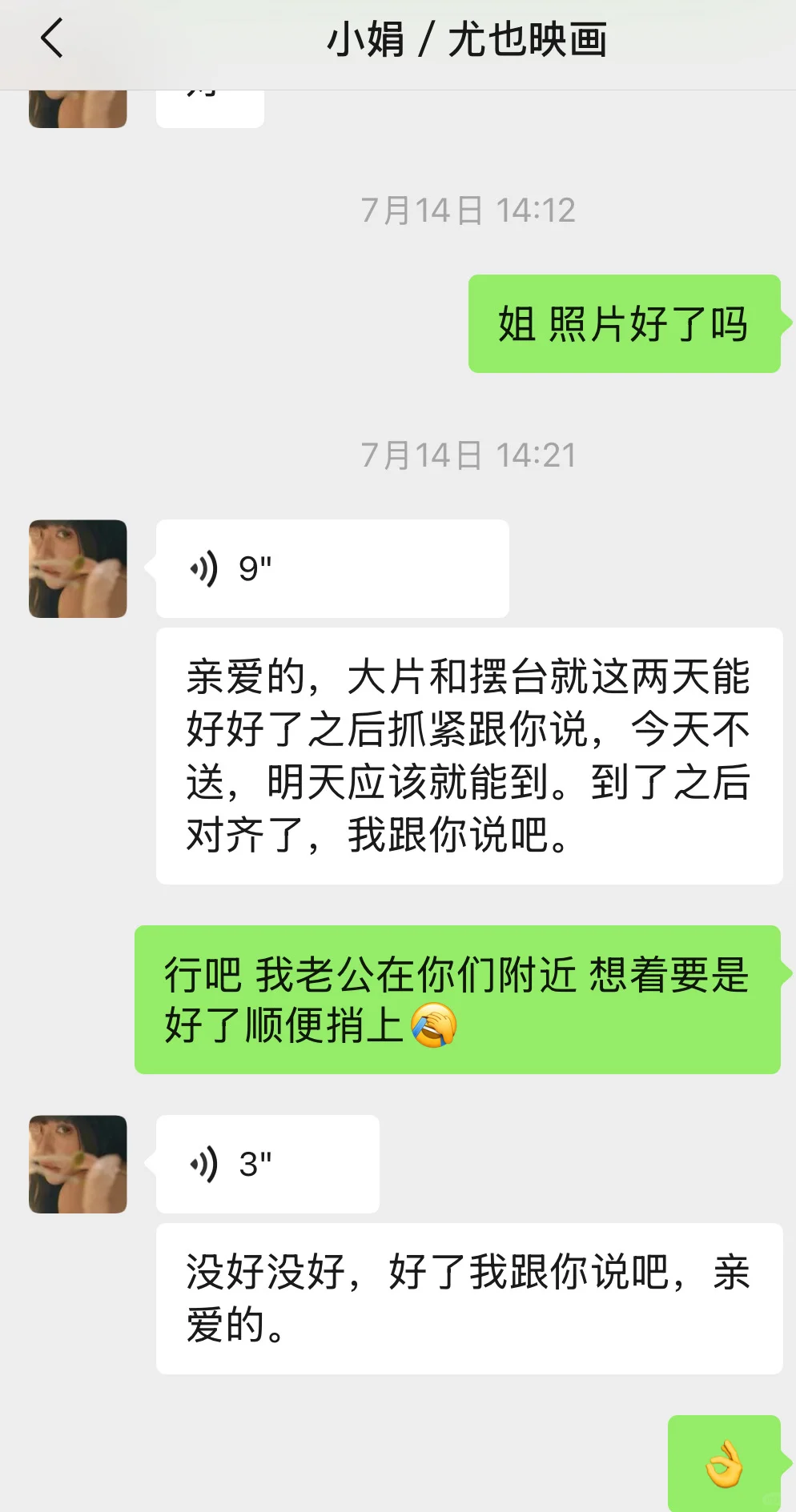 同一家俩名字,直播间拍的时候啥都说的好听,6月初拍的,6月底精修是我问了才发给我的,相框摆台得催了一个多月才到手,问就是明天,这几天,快递也是,我跟她要单号才给我发的,不会不知道能看到揽收时间吧,把别人当傻子?真以为孕妇一孕傻三年了???