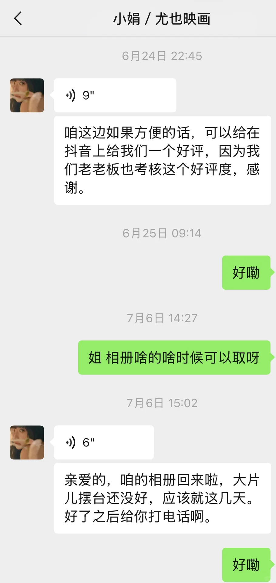 说好的底片全送,到现在不给我,消息也不回了就这样我选片的时候还让我百天照去他家拍呢,我敢去么,得亏没定,还跟我要好评,我咋给好评??